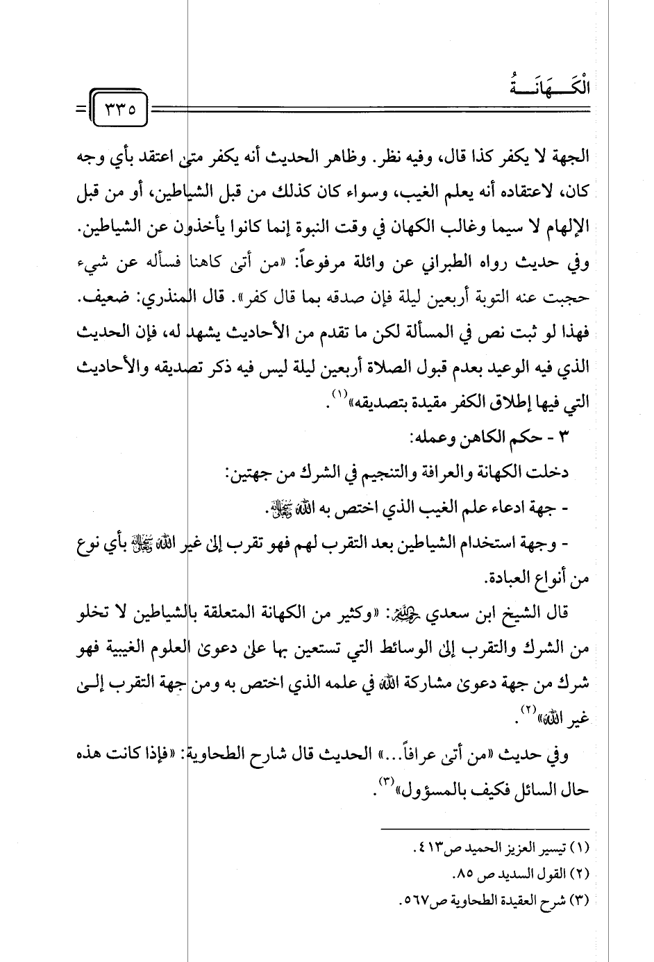 قال الشيخ ابن سعدي رحمه الله: "وكثير من الكهانة المتعلقة بالشياطين لا تخلو من الشرك والتقرب إلى الوسائط التي تستعين بها على دعوى لعلوم الغيبية فهو شرك من جهة دعوى مشاركة الله في علمه الذي اختص به ومن جهة التقرب إلى غير الله" (¬٢).