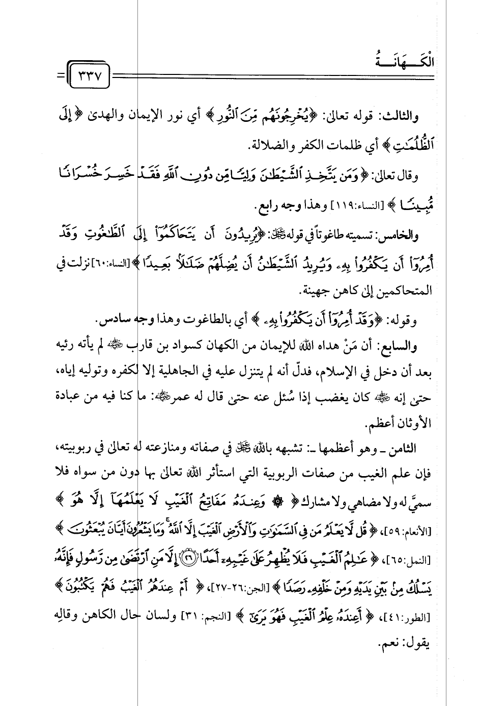 والخامس: تسميته طاغوتًا في قوله عزَّ وجلَّ: {يُرِيدُونَ أَنْ يَتَحَاكَمُوا إِلَى الطَّاغُوتِ وَقَدْ أُمِرُوا أَنْ يَكْفُرُوا بِهِ وَيُرِيدُ الشَّيْطَانُ أَنْ يُضِلَّهُمْ ضَلَالًا بَعِيدًا} [النساء:٦٠] نزلت في المتحاكمين إلى كاهن جهينة.