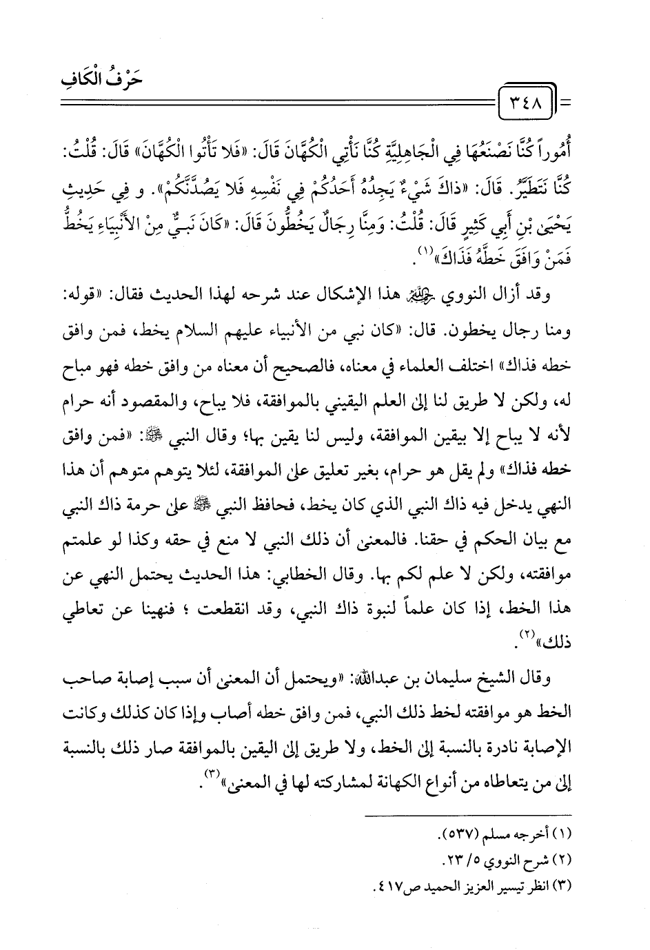 وقال الشيخ سليمان بن عبد الله: "ويحتمل أن المعنى أن سبب إصابة صاحب الخط هو موافقته لخط ذلك النبي، فمن وافق خطه أصاب وإذا كان كذلك وكانت الإصابة نادرة بالنسبة إلى الخط، ولا طريق إلى اليقين بالموافقة صار ذلك بالنسبة إلى من يتعاطاه من أنواع الكهانة لمشاركته لها في المعنى" (¬٣).