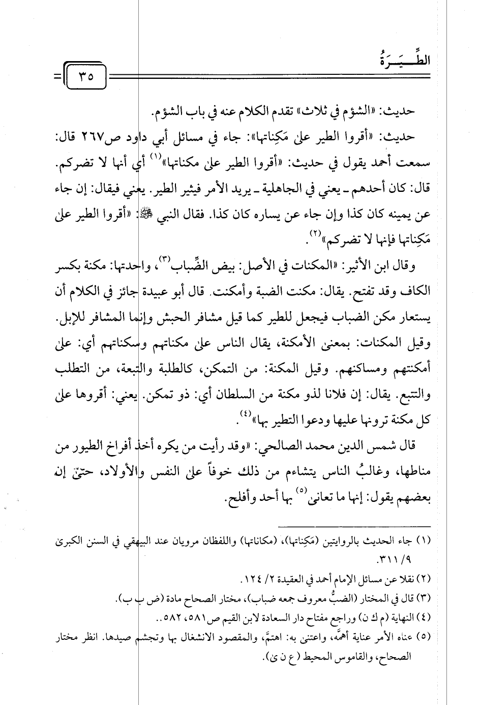 حديث: "أقروا الطير على مَكِناتها": جاء في مسائل أبي داود ص ٢٦٧ قال: سمعت أحمد يقول في حديث: "أقروا الطير على مكناتها" (¬١) أي أنها لا تضركم. قال: كان أحدهم - يعني في الجاهلية - يريد الأمر فيثير الطير. يعني فيقال: إن جاء عن يمينه كان كذا وإن جاء عن يساره كان كذا. فقال النبي - صلى الله عليه وسلم -: "أقروا الطير على مَكِناتها فإنها لا تضركم" (¬٢).