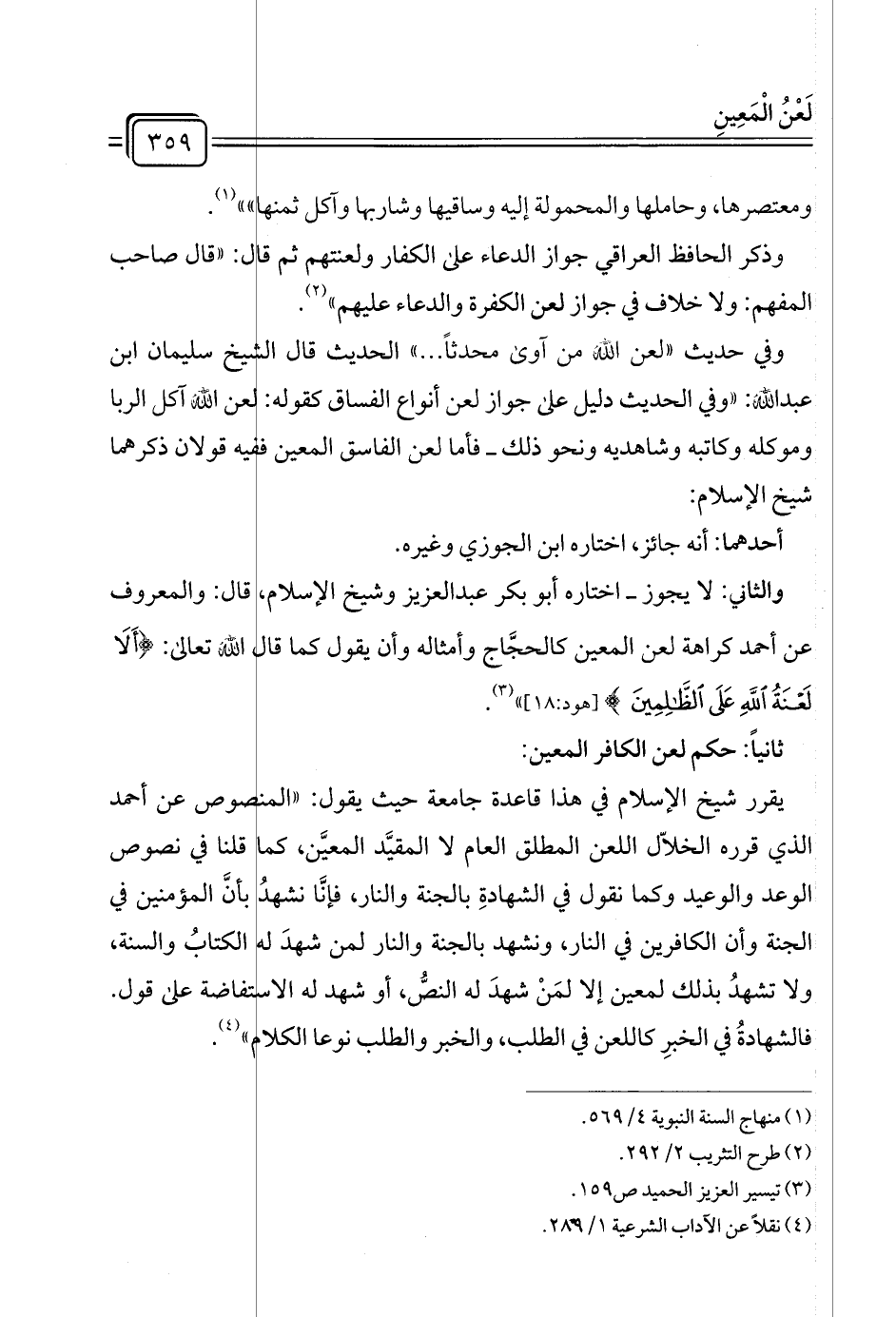 والثاني: لا يجوز - اختاره أبو بكر عبد العزيز وشيخ الإسلام، قال: والمعروف عن أحمد كراهة لعن المعين كالحجَّاج وأمثاله وأن يقول كما قال الله تعالى: {أَلَا لَعْنَةُ اللَّهِ عَلَى الظَّالِمِينَ} [هود:١٨] " (¬٣).