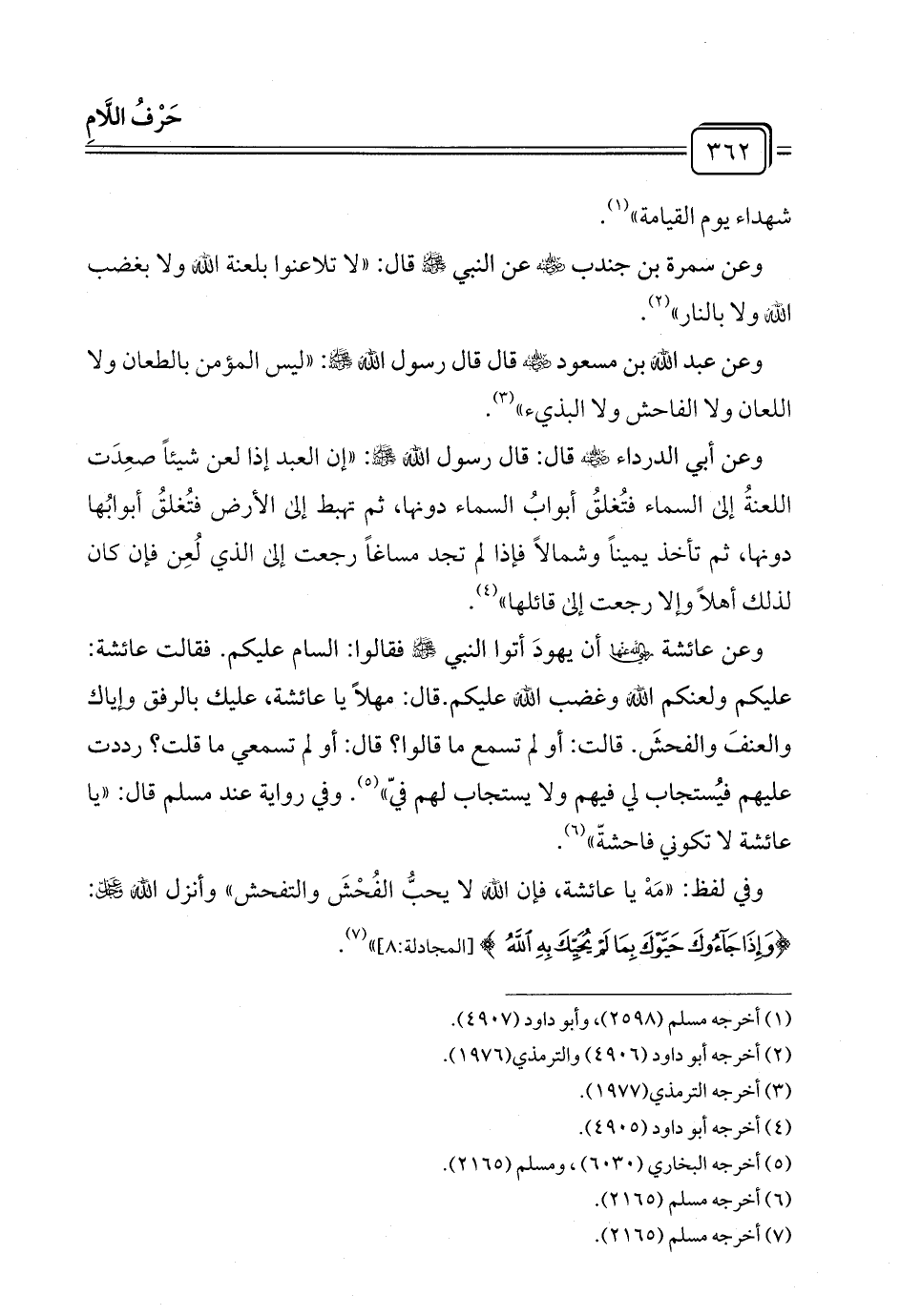وعن سمرة بن جندب - رضي الله عنه - عن النبي - صلى الله عليه وسلم - قال: "لا تلاعنوا بلعنة الله ولا بغضب الله ولا بالنار" (¬٢).