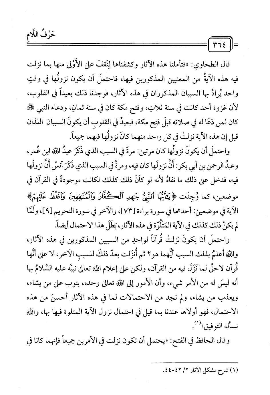 واحتملَ أن يكونَ نزلتْ قُرآنًا لواحدِ من السببين المذكورين في هذه الآثار، والله أعلمُ بذلك السبب أيُّهما هو؟ ثم أُنزَلت بعدّ ذلكَ للسببِ الآخر، لا على أَنَّها قُرآن لاحقٌ لما نَزَلَ فيه من القرآن، ولكن على إعلام الله تعالى نبيَّه عليه السَّلامُ بها أنه ليسَ له من الأمر شيء، وأن الأمور إلى الله تعالى وحده، يتوب على من يشاء، ويعذب من يشاء، ولم نجد من الاحتمالات لما في هذه الآثار أحسنَ من هذه الاحتمال، فهو أولاها عندنا بما قيل في احتمال نزول الآية المتلوة فيها بها، والله نسأله التوفيق" (¬١).