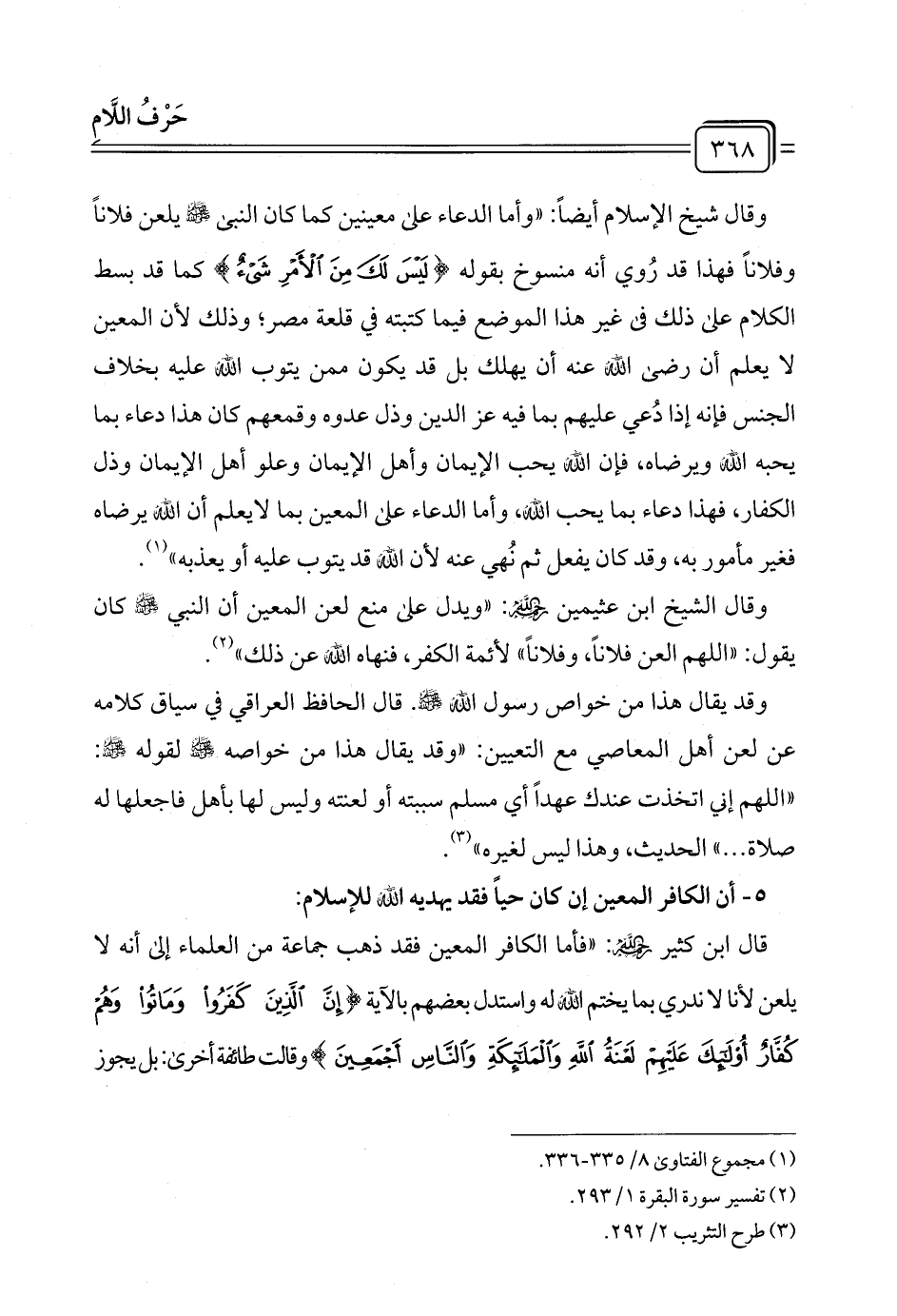 وقال الشيخ ابن عثيمين رحمه الله: "ويدل على منع لعن المعين أن النبي - صلى الله عليه وسلم - كان يقول: "اللهم العن فلانًا، وفلانًا" لأئمة الكفر، فنهاه الله عن ذلك" (¬٢).