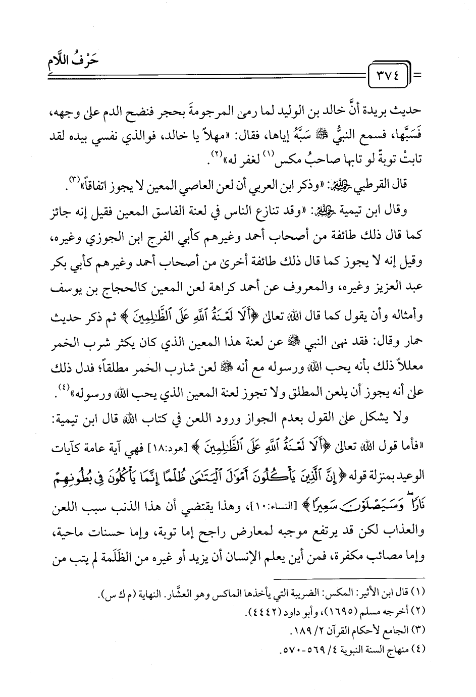 وقال ابن تيمية رحمه الله: "وقد تنازع الناس في لعنة الفاسق المعين فقيل إنه جائز كما قال ذلك طائفة من أصحاب أحمد وغيرهم كأبي الفرج بن الجوزي وغيره، وقيل إنه لا يجوز كما قال ذلك طائفة أخرى من أصحاب أحمد وغيرهم كأبي بكر عبد العزيز وغيره، والمعروف عن أحمد كراهة لعن المعين كالحجاج بن يوسف وأمثاله وأن يقول كما قال الله تعالى {أَلَا لَعْنَةُ اللَّهِ عَلَى الظَّالِمِينَ} ثم ذكر حديث حمار وقال: فقد نهى النبي - صلى الله عليه وسلم - عن لعنة هذا المعين الذي كان يكثر شرب الخمر معللًا ذلك بأنه يحب الله ورسوله مع أنه - صلى الله عليه وسلم - لعن شارب الخمر مطلقًا؛ فدل ذلك على أنه يجوز أن يلعن المطلق ولا تجوز لعنة المعين الذي يحب الله ورسوله" (¬٤).