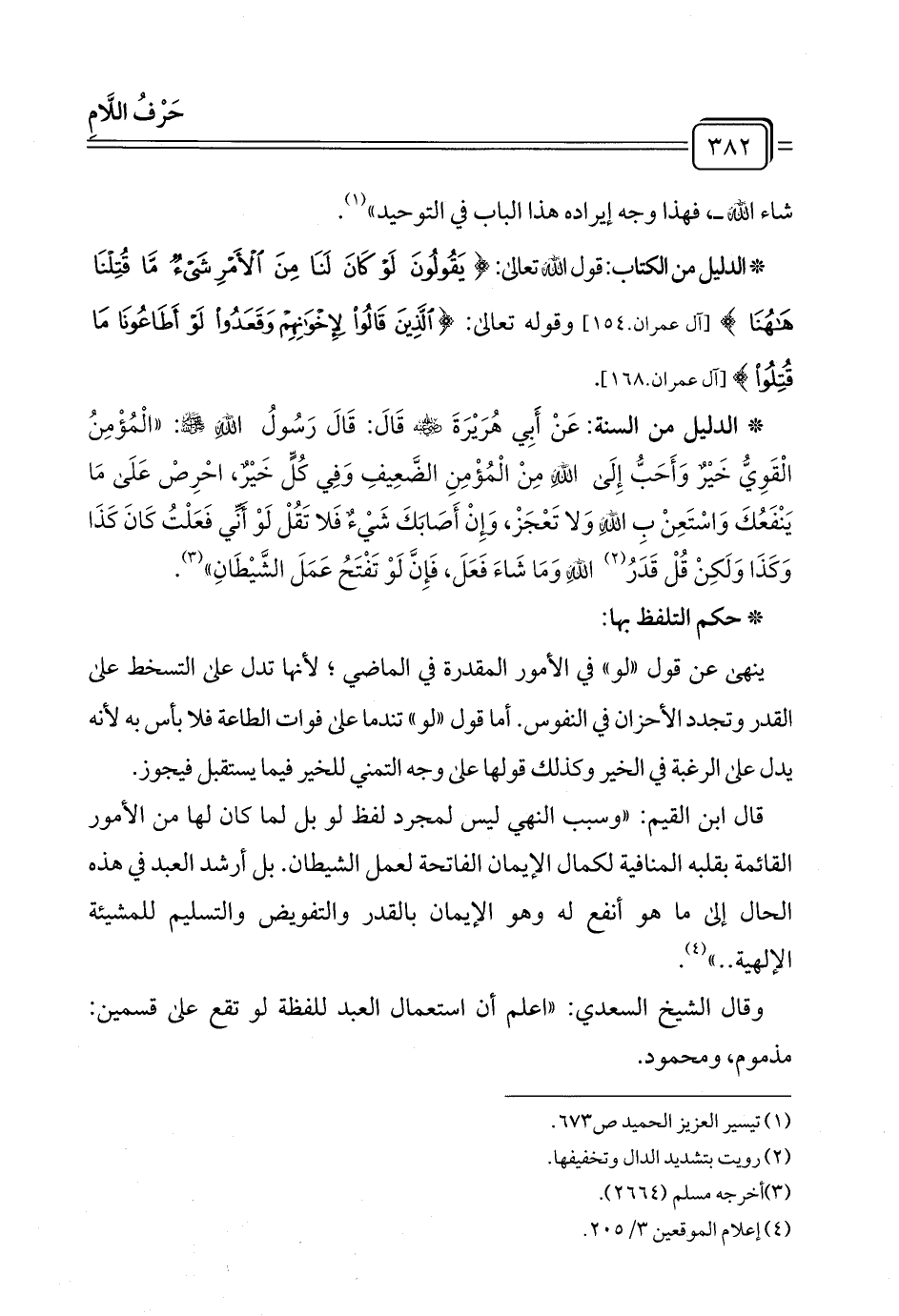 * الدليل من السنة: عَنْ أَبِي هُرَيْرَةَ - رضي الله عنه - قَالَ: قَالَ رَسُولُ الله - صلى الله عليه وسلم -: "الْمُؤْمِنُ الْقَوِيُّ خَيْرٌ وَأَحَبُّ إِلَى الله مِنْ الْمُؤْمِنِ الضَّعِيفِ وَفِي كُلٍّ خَيْر، احْرِصْ عَلَى مَا يَنْفَعُكَ وَاسْتَعِنْ بِـ الله وَلا تَعْجَزْ، وَإِنْ أَصَابَكَ شَيْءٌ فَلا تَقُلْ لَوْ أَنِّي فَعَلْتُ كَانَ كَذَا وَكَذَا وَلَكِنْ قُلْ قَدَرُ (¬٢) اللِه وَمَا شَاءَ فَعَلَ، فَإِنَّ لَوْ تَفْتَحُ عَمَلَ الشَّيْطَانِ" (¬٣).