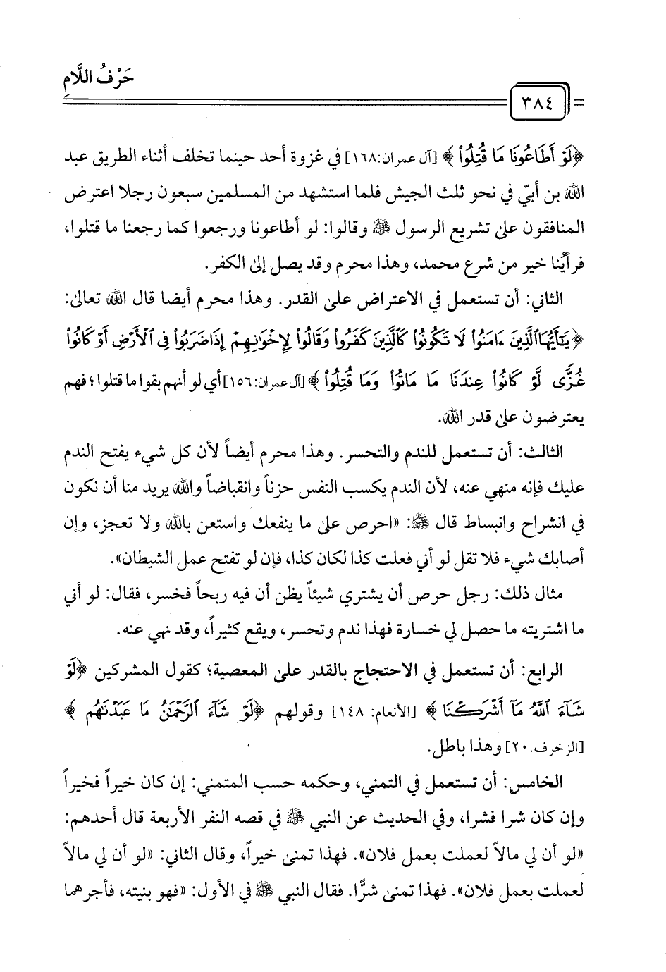 الثاني: أن تستعمل في الاعتراض على القدر. وهذا محرم أيضا قال الله تعالى: {يَاأَيُّهَا الَّذِينَ آمَنُوا لَا تَكُونُوا كَالَّذِينَ كَفَرُوا وَقَالُوا لإِخْوَانِهِمْ إِذَا ضَرَبُوا فِي الْأَرْضِ أَوْ كَانُوا غُزًّى لَوْ كَانُوا عِنْدَنَا مَا مَاتُوا وَمَا قُتِلُوا} [آل عمران: ١٥٦] أي لو أنهم بقوا ما قتلوا؛ فهم يعترضون على قدر الله.