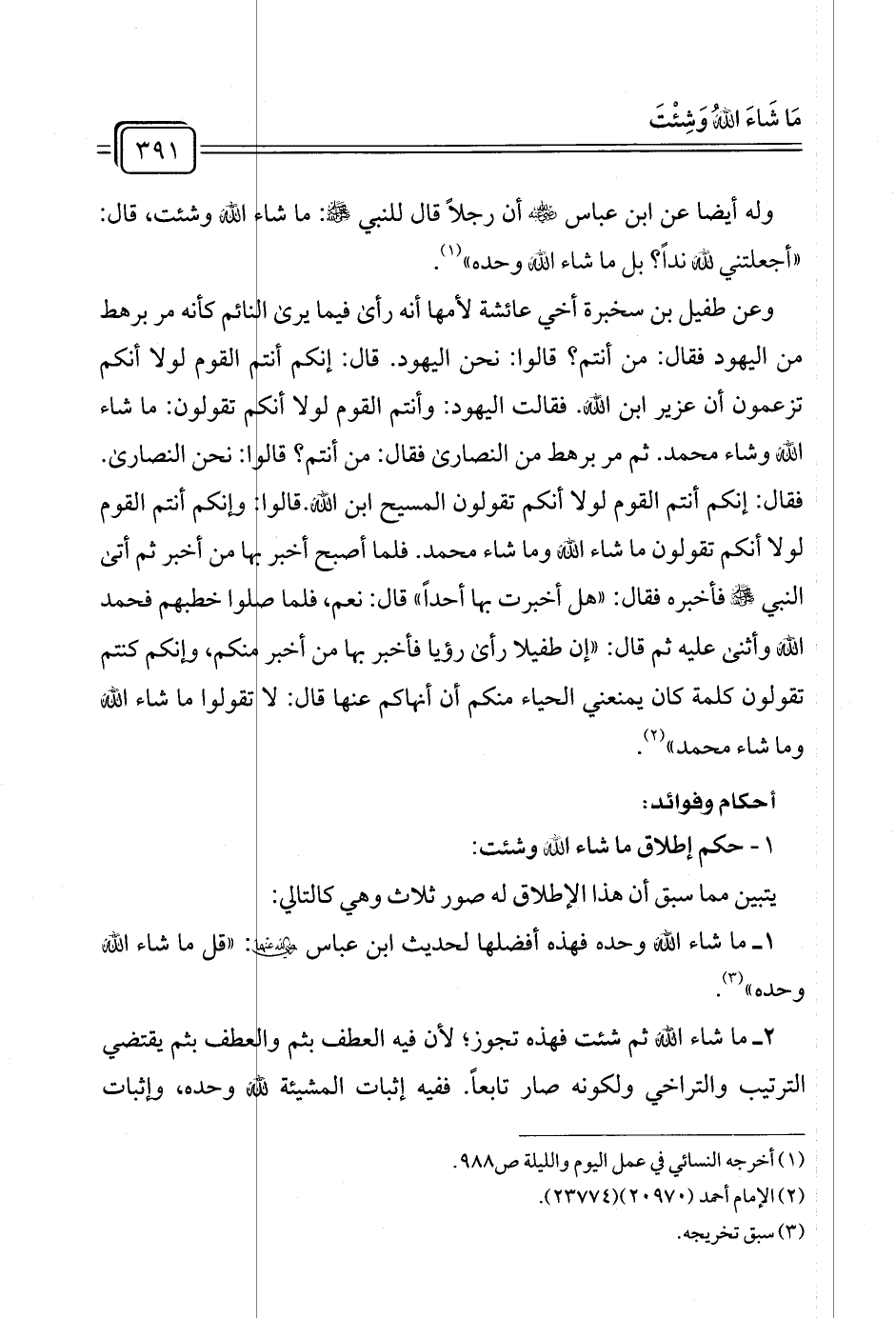 ٢ - ما شاء الله ثم شئت فهذه تجوز؛ لأن فيه العطف بثم والعطف بثم يقتضي الترتيب والتراخي ولكونه صار تابعًا. ففيه إثبات المشيئة لله وحده، وإثبات