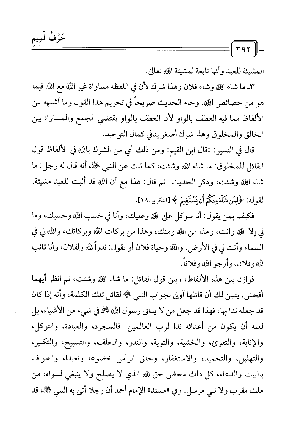 ٣ - ما شاء الله وشاء فلان وهذا شرك لأن في اللفظة مساواة غير الله مع الله فيما هو من خصائص الله. وجاء الحديث صريحًا في تحريم هذا القول وما أشبهه من الألفاظ مما فيه العطف بالواو لأن العطف بالواو يقتضي الجمع والمساواة بين الخالق والمخلوق وهذا شرك أصغر ينافي كمال التوحيد.