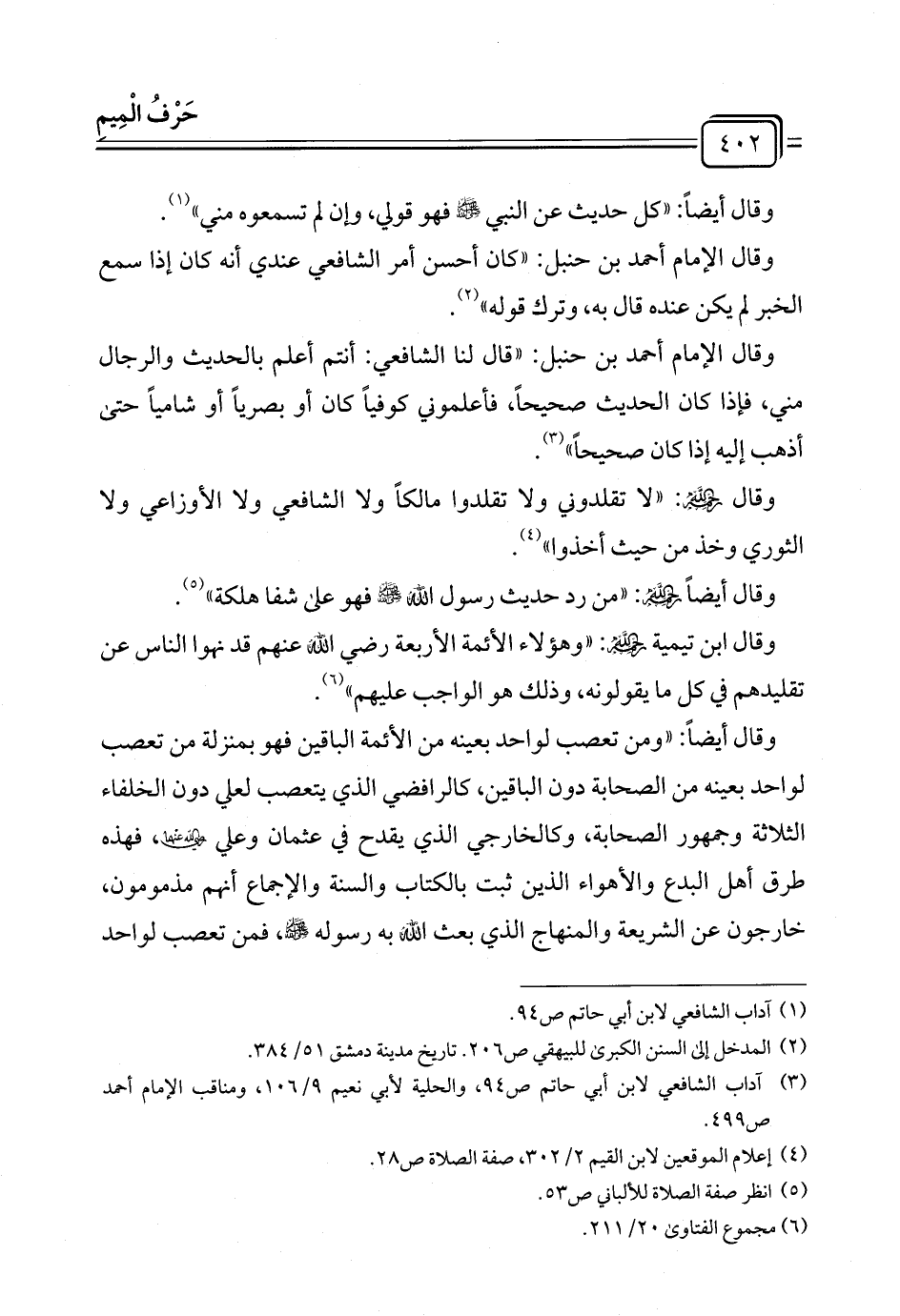 وقال أيضًا: "ومن تعصب لواحد بعينه من الأئمة الباقين فهو بمنزلة من تعصب لواحد بعينه من الصحابة دون الباقين، كالرافضي الذي يتعصب لعلي دون الخلفاء الثلاثة وجمهور الصحابة، وكالخارجي الذي يقدح في عثمان وعلي - رضي الله عنهما -، فهذه طرق أهل البدع والأهواء الذين ثبت بالكتاب والسنة والإجماع أنهم مذمومون، خارجون عن الشريعة والمنهاج الذي بعث الله به رسوله - صلى الله عليه وسلم -، فمن تعصب لواحد