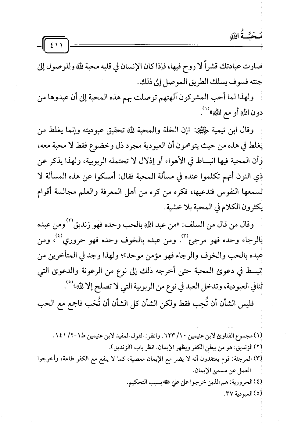 وقال من قال من السلف: "من عبد الله بالحب وحده فهو زنديق (¬٢) ومن عبده بالرجاء وحده فهو مرجئ (¬٣). ومن عبده بالخوف وحده فهو حروري (¬٤)، ومن عبده بالحب والخوف والرجاء فهو مؤمن موحد"؛ ولهذا وجد في المتأخرين من انبسط في دعوى المحبة حتى أخرجه ذلك إلى نوع من الرعونة والدعوى التي تنافي العبودية، وتدخل العبد في نوع من الربوبية التي لا تصلح إلا لله" (¬٥).