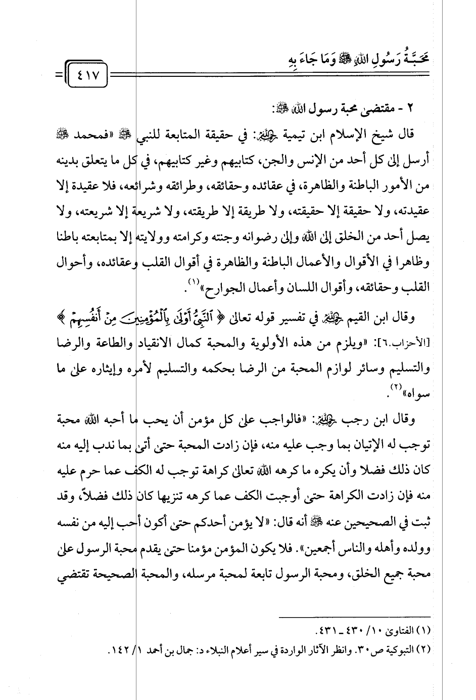 ٢ - مقتضى محبة رسول الله - صلى الله عليه وسلم -: