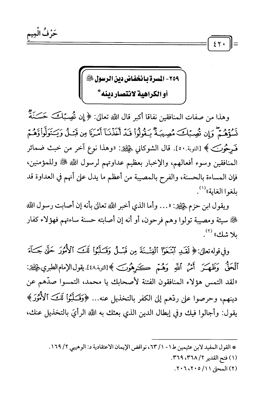 ٢٥٩ - المسرة بانخفاض دين الرسول - صلى الله عليه وسلم - أو الكراهية لانتصار دينه *