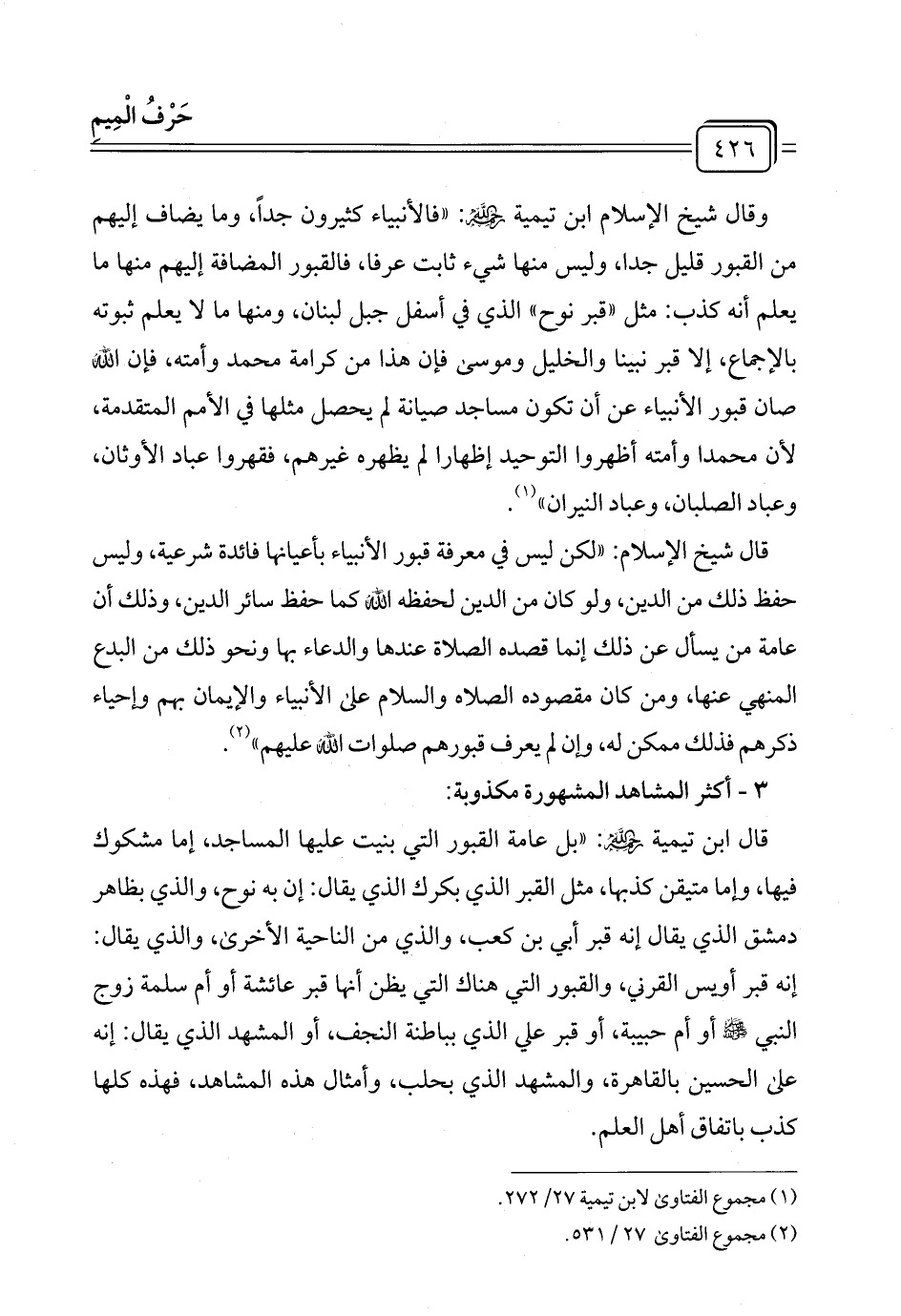 قال ابن تيمية رحمه الله: "بل عامة القبور التي بنيت عليها المساجد، إما مشكوك فيها، وإما متيقن كذبها، مثل القبر الذي بكرك الذي يقال: إن به نوح، والذي بظاهر دمشق الذي يقال إنه قبر أبي بن كعب، والذي من الناحية الأخرى، والذي يقال: إنه قبر أويس القرني، والقبور التي هناك التي يظن أنها قبر عائشة أو أم سلمة زوج النبي - صلى الله عليه وسلم - أو أم حبيبة، أو قبر علي الذي بباطنة النجف، أو المشهد الذي يقال: إنه على الحسين بالقاهرة، والمشهد الذي بحلب، وأمثال هذه المشاهد، فهذه كلها كذب باتفاق أهل العلم.