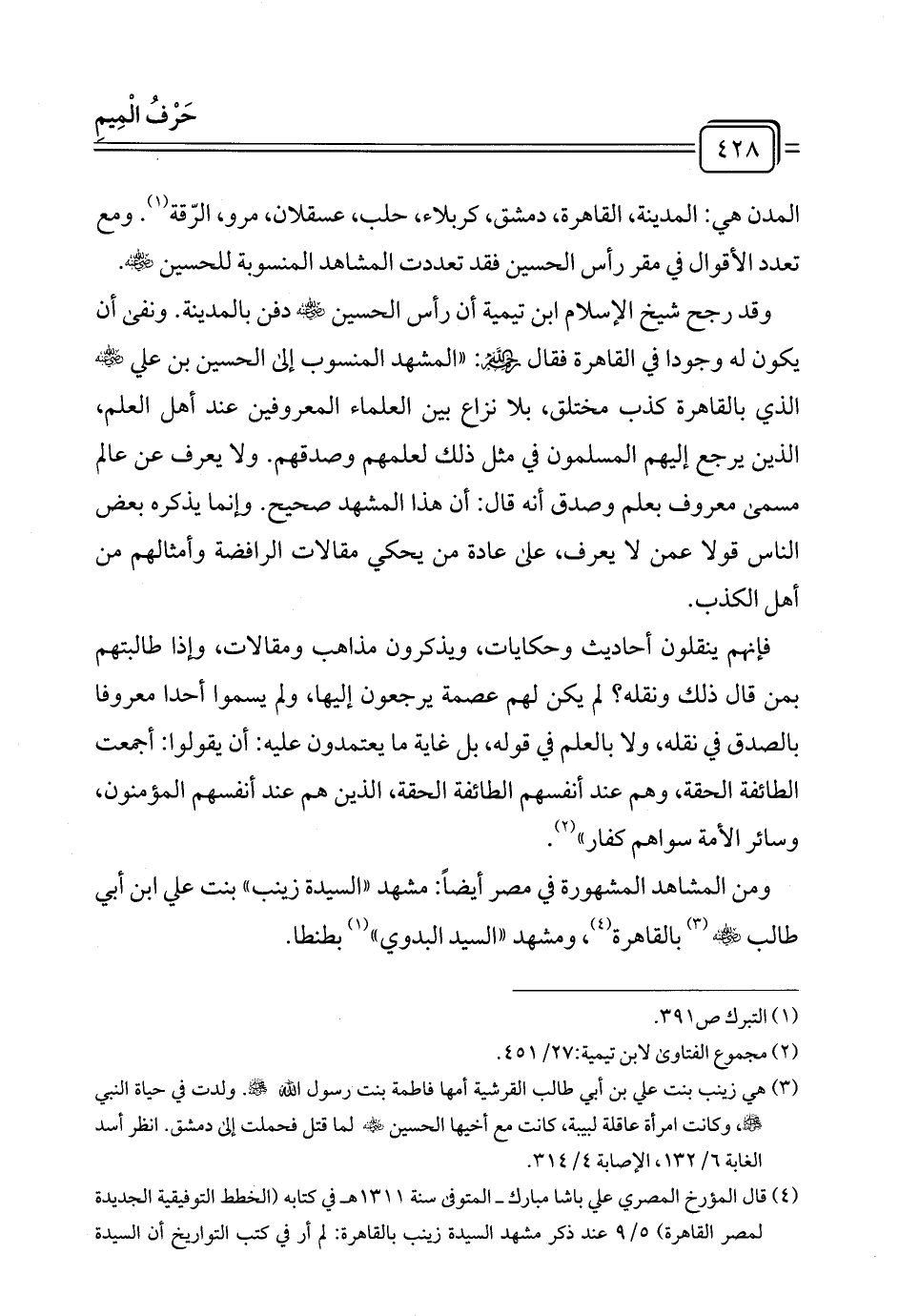 (¬٤) قال المؤرخ المصري علي باشا مبارك - المتوفى سنة ١٣١١ هـ في كتابه (الخطط التوفيقية الجديدة لمصر القاهرة) ٥/ ٩ عند ذكر مشهد السيدة زينب بالقاهرة: لم أر في كتب التواريخ أن السيدة = زينب بنت علي - رضي الله عنها - جاءت إلى مصر في الحياة أو بعد الممات.