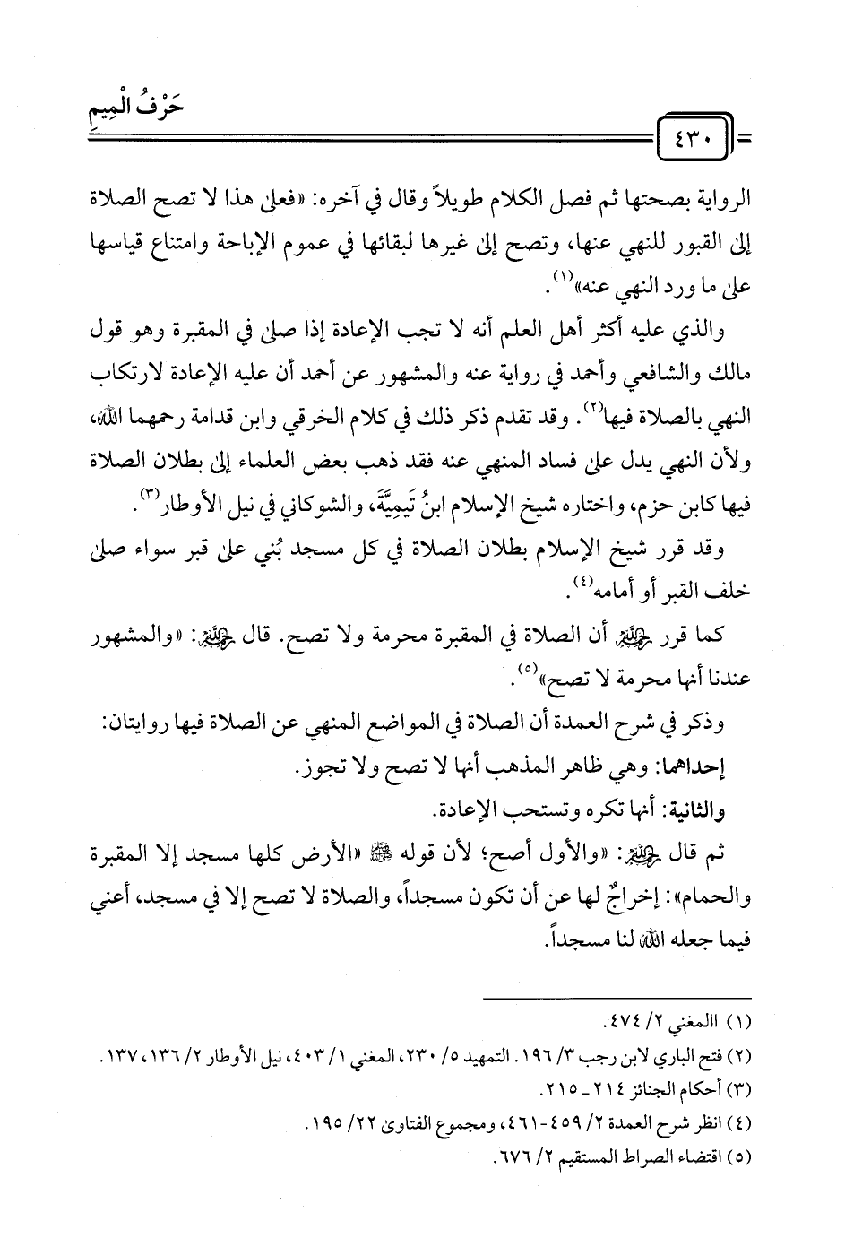 وقد قرر شيخ الإسلام بطلان الصلاة في كل مسجد بُني على قبر سواء صلى خلف القبر أو أمامه (¬٤).