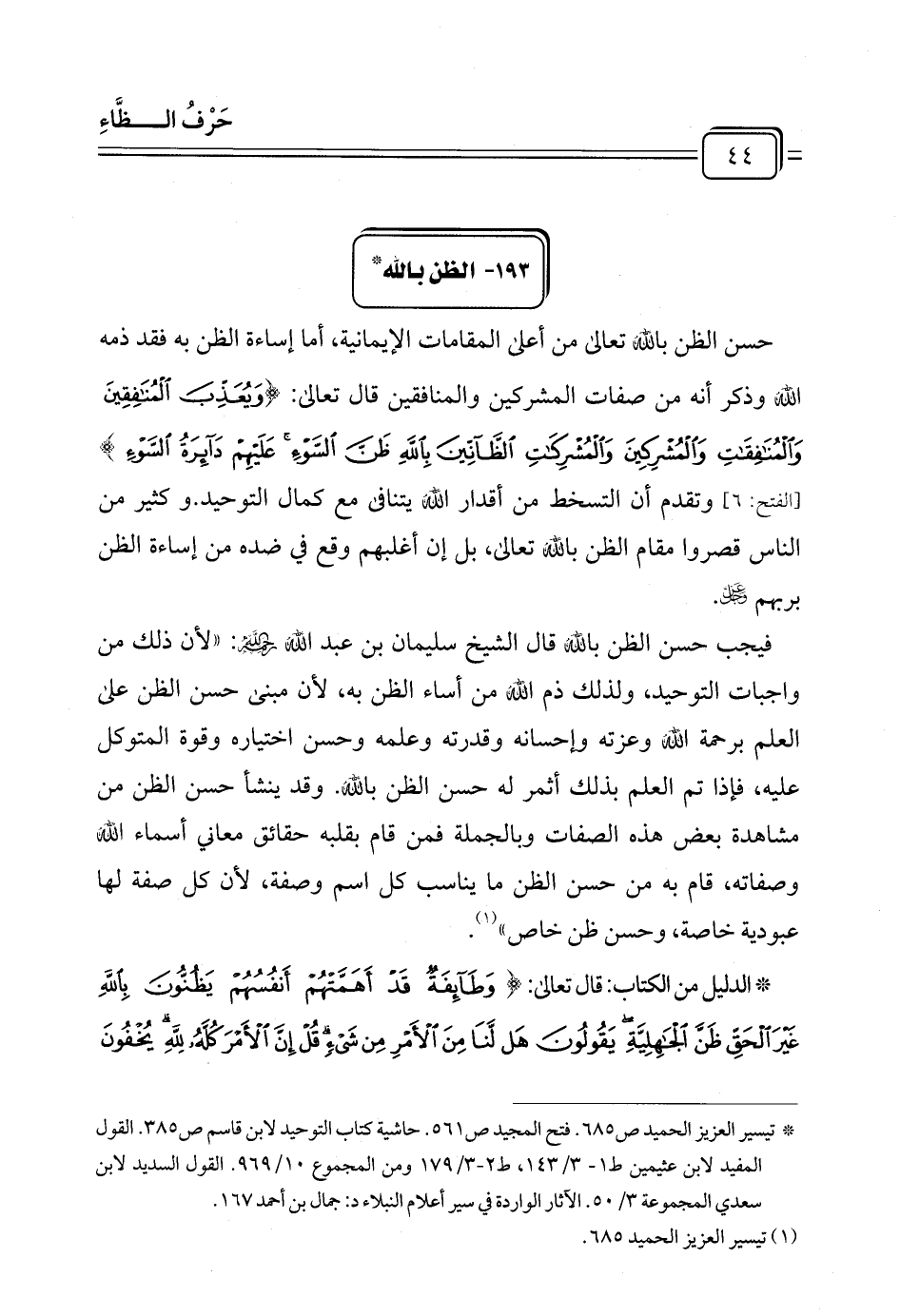 حسن الظن بالله تعالى من أعلى المقامات الإيمانية، أما إساءة الظن به فقد ذمه الله وذكر أنه من صفات المشركين والمنافقين قال تعالى: {وَيُعَذِّبَ الْمُنَافِقِينَ وَالْمُنَافِقَاتِ وَالْمُشْرِكِينَ وَالْمُشْرِكَاتِ الظَّانِّينَ بِاللَّهِ ظَنَّ السَّوْءِ عَلَيْهِمْ دَائِرَةُ السَّوْءِ} [الفتح: ٦] وتقدم أن التسخط من أقدار الله يتنافى مع كمال التوحيد. وكثير من الناس قصروا مقام الظن بالله تعالى، بل إن أغلبهم وقع في ضده من إساءة الظن بربهم عز وجل.