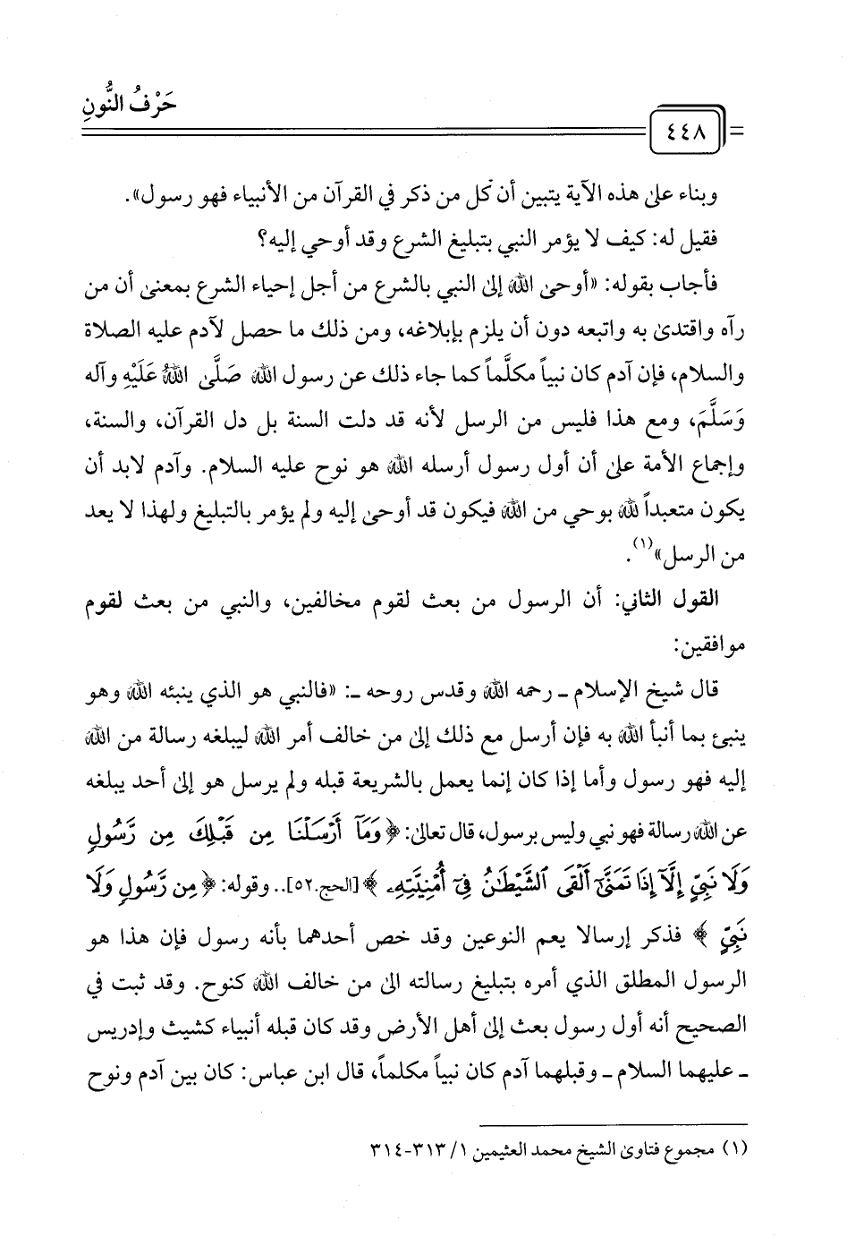 قال شيخ الإسلام - رحمه الله وقدس روحه -: "فالنبي هو الذي ينبئه الله وهو ينبئ بما أنبأ الله به فإن أرسل مع ذلك إلى من خالف أمر الله ليبلغه رسالة من الله إليه فهو رسول وأما إذا كان إنما يعمل بالشريعة قبله ولم يرسل هو إلى أحد يبلغه عن الله رسالة فهو نبي وليس برسول، قال تعالى: {وَمَا أَرْسَلْنَا مِنْ قَبْلِكَ مِنْ رَسُولٍ وَلَا نَبِيٍّ إِلَّا إِذَا تَمَنَّى أَلْقَى الشَّيْطَانُ فِي أُمْنِيَّتِهِ} [الحج: ٥٢] .. وقوله: {مِنْ رَسُولٍ وَلَا نَبِيٍّ} فذكر إرسالا يعم النوعين وقد خص أحدهما بأنه رسول فإن هذا هو الرسول المطلق الذي أمره بتبليغ رسالته إلى من خالف الله كنوح. وقد ثبت في الصحيح أنه أول رسول بعث إلى أهل الأرض وقد كان قبله أنبياء كشيث وإدريس - عليهما السلام - وقبلهما آدم كان نبيًا مكلمًا، قال ابن عباس: كان بين آدم ونوح