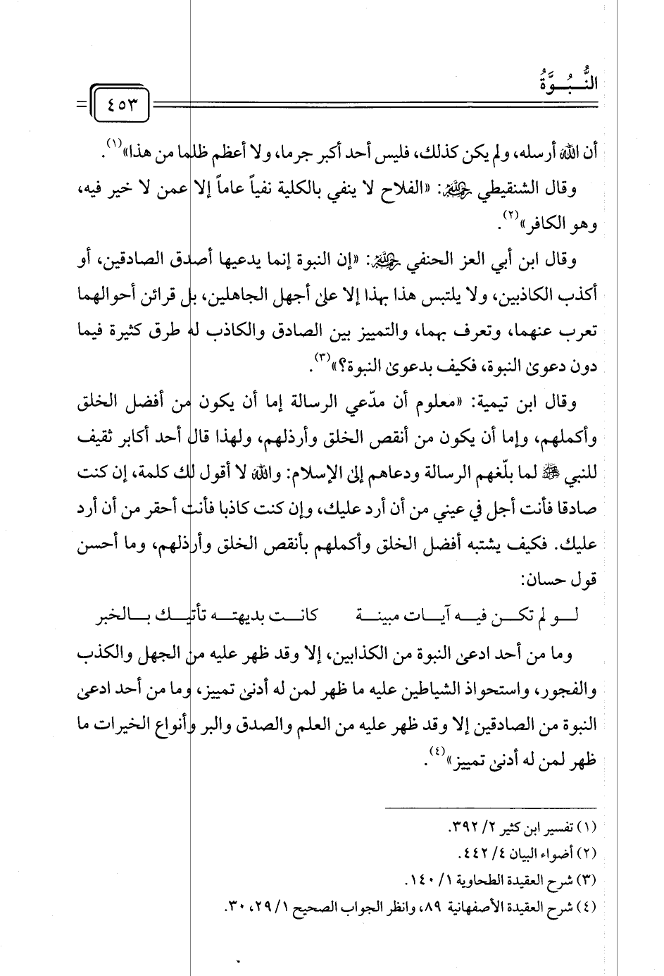 وقال ابن أبي العز الحنفي - رحمه الله -: "إن النبوة إنما يدعيها أصدق الصادقين، أو أكذب الكاذبين، ولا يلتبس هذا بهذا إلا على أجهل الجاهلين، بل قرائن أحوالهما تعرب عنهما، وتعرف بهما، والتمييز بين الصادق والكاذب له طرق كثيرة فيما دون دعوى النبوة، فكيف بدعوى النبوة؟ " (¬٣).