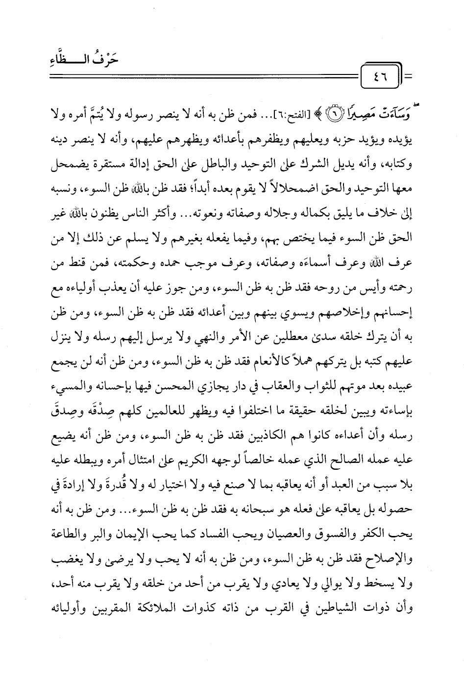 وَسَاءَتْ مَصِيرًا (٦)} [الفتح: ٦] ... فمن ظن به أنه لا ينصر رسوله ولا يُتمَّ أمره ولا يؤيده ويؤيد حزبه ويعليهم ويظفرهم بأعدائه ويظهرهم عليهم، وأنه لا ينصر دينه وكتابه، وأنه يديل الشرك على التوحيد والباطل على الحق إدالة مستقرة يضمحل معها التوحيد والحق اضمحلالًا لا يقوم بعده أبدًا؛ فقد ظن بالله ظن السوء، ونسبه إلى خلاف ما يليق بكماله وجلاله وصفاته ونعوته ... وأكثر الناس يظنون بالله غير الحق ظن السوء فيما يختص بهم، وفيما يفعله بغيرهم ولا يسلم عن ذلك إلا من عرف الله وعرف أسماءَه وصفاته، وعرف موجب حمده وحكمته، فمن قنط من رحمته وأيس من روحه فقد ظن به ظن السوء، ومن جوز عليه أن يعذب أولياءه مع إحسانهم وإخلاصهم ويسوي بينهم وبين أعدائه فقد ظن به ظن السوء، ومن ظن به أن يترك خلقه سدى معطلين عن الأمر والنهي ولا يرسل إليهم رسله ولا ينزل عليهم كتبه بل يتركهم هملًا كالأنعام فقد ظن به ظن السوء، ومن ظن أنه لن يجمع عبيده بعد موتهم للثواب والعقاب بها دار يجازي المحسن فيها بإحسانه والمسيء بإساءته ويبين لخلقه حقيقة ما اختلفوا فيه ويظهر للعالمين كلهم صِدْقَه وصِدقَ رسله وأن أعداءه كانوا هم الكاذبين فقد ظن به ظن السوء، ومن ظن أنه يضيع عليه عمله الصالح الذي عمله خالصًا لوجهه الكريم على امتثال أمره ويبطله عليه بلا سبب من العبد أو أنه يعاقبه بما لا صنع فيه ولا اختيار له ولا قُدرةَ ولا إرادةَ في حصوله بل يعاقبه على فعله هو سبحانه به فقد ظن به ظن السوء ... ومن ظن به أنه يحب الكفر والفسوق والعصيان ويحب الفساد كما يحب الإيمان والبر والطاعة والإصلاح فقد ظن به ظن السوء، ومن ظن به أنه لا يحب ولا يرضى ولا يغضب ولا يسخط ولا يوالي ولا يعادي ولا يقرب من أحد من خلقه ولا يقرب منه أحد، وأن ذوات الشياطين بها القرب من ذاته كذوات الملائكة المقربين وأوليائه