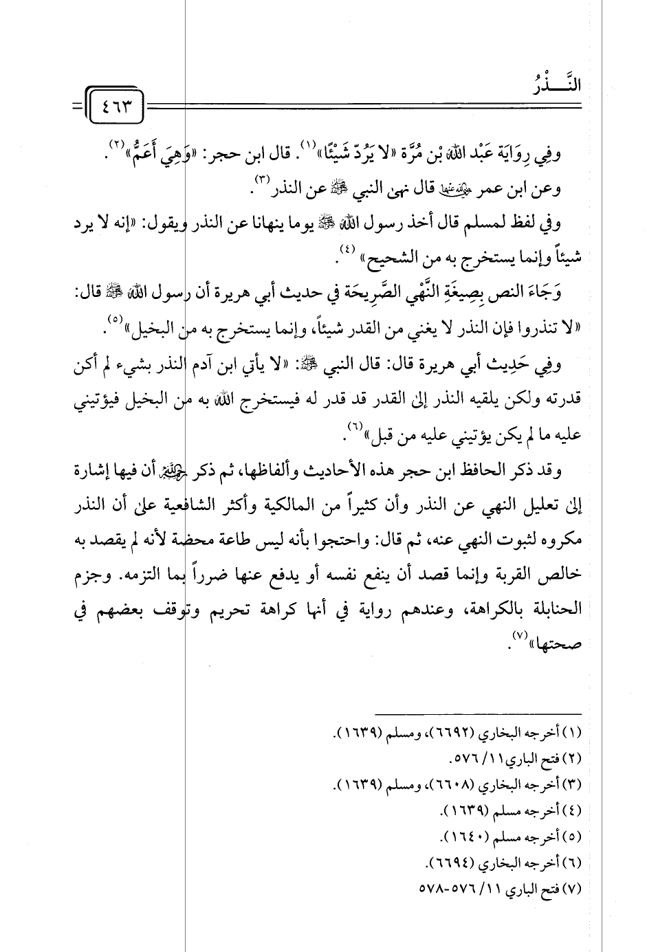 وَجَاءَ النص بِصِيغَةِ النَّهْي الصَّرِيحَة في حديث أبي هريرة أن رسول الله - صلى الله عليه وسلم - قال: "لا تنذروا فإن النذر لا يغني من القدر شيئًا، وإنما يستخرج به من البخيل" (¬٥).