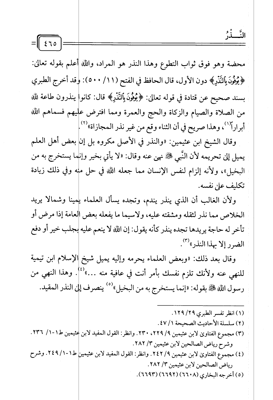 وقال بعد ذلك: "وبعض العلماء يحرمه وإليه يميل شيخ الإسلام ابن تيمية للنهي عنه ولأنك تلزم نفسك بأمر أنت في عافية منه ... " (¬٤). وهذا النهي من رسول الله - صلى الله عليه وسلم - بقوله: "إنما يستخرج به من البخيل" (¬٥) ينصرف إلى النذر المقيد.