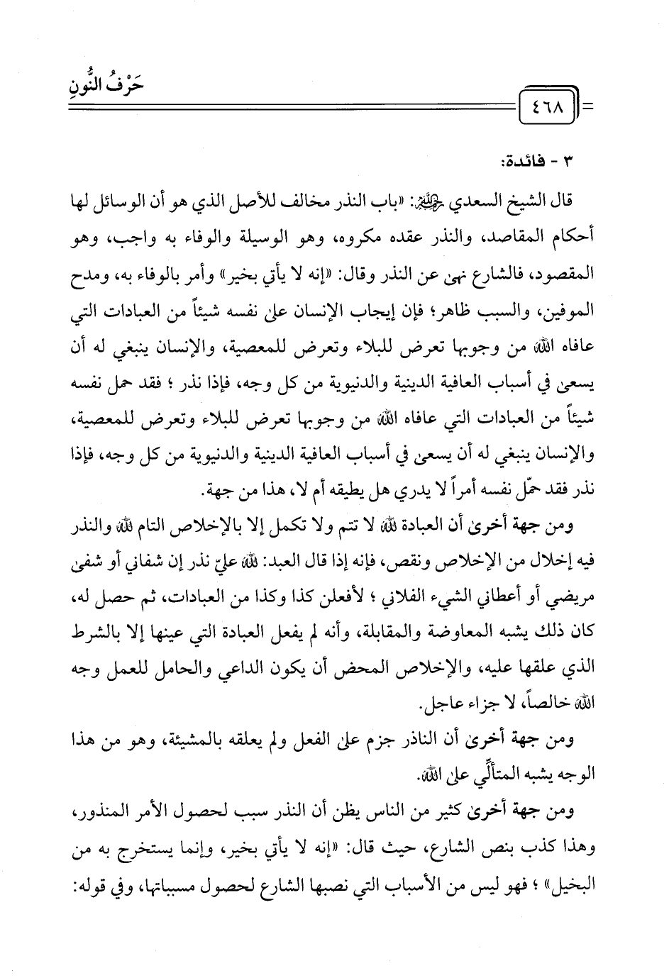 قال الشيخ السعدي - رحمه الله -: "باب النذر مخالف للأصل الذي هو أن الوسائل لها أحكام المقاصد، والنذر عقده مكروه، وهو الوسيلة والوفاء به واجب، وهو المقصود، فالشارع نهى عن النذر وقال: "إنه لا يأتي بخير" وأمر بالوفاء به، ومدح الموفين، والسبب ظاهر؛ فإن إيجاب الإنسان على نفسه شيئًا من العبادات التي عافاه الله من وجوبها تعرض للبلاء وتعرض للمعصية، والإنسان ينبغي له أن يسعى في أسباب العافية الدينية والدنيوية من كل وجه، فإذا نذر؛ فقد حمل نفسه شيئًا من العبادات التي عافاه الله من وجوبها تعرض للبلاء وتعرض للمعصية، والإنسان ينبغي له أن يسعى في أسباب العافية الدينية والدنيوية من كل وجه، فإذا نذر فقد حمّل نفسه أمرًا لا يدري هل يطيقه أم لا، هذا من جهة.