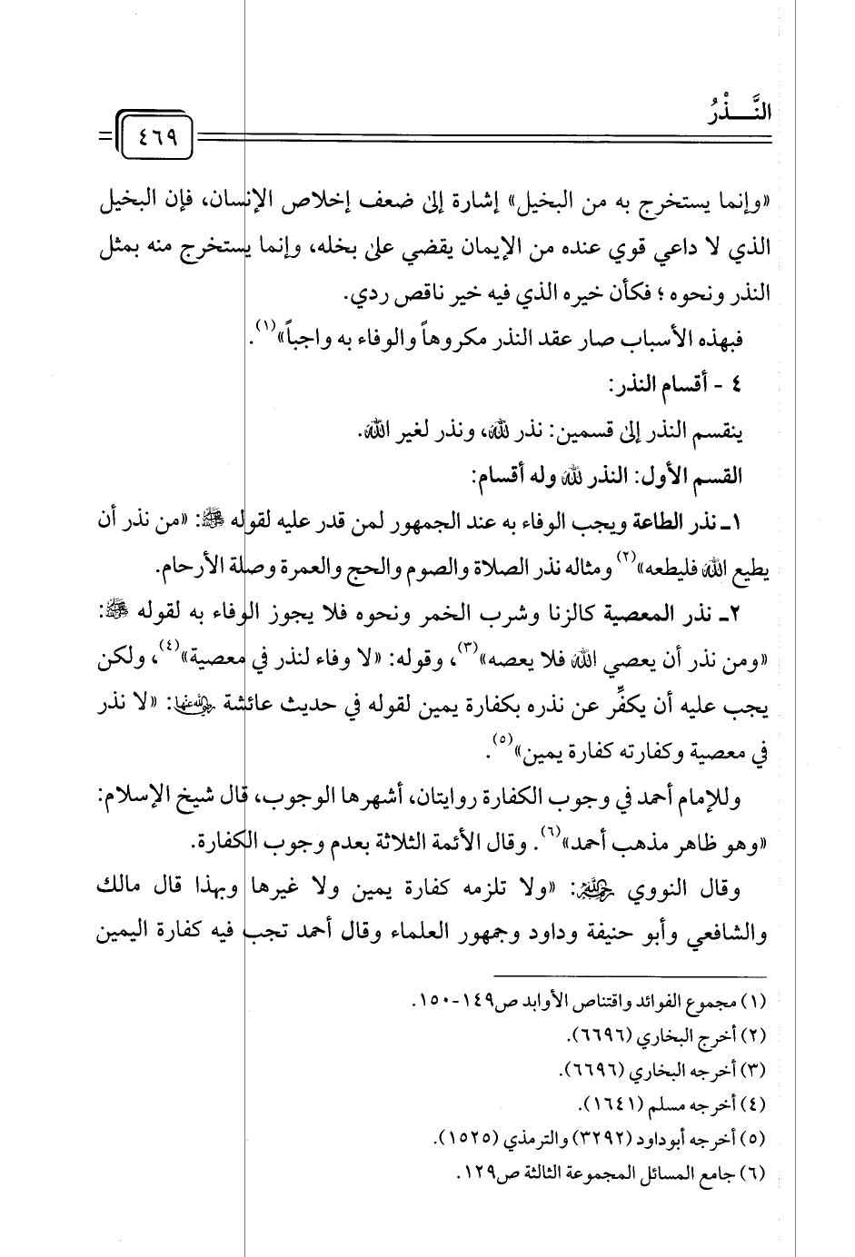 ٢ - نذر المعصية كالزنا وشرب الخمر ونحوه فلا يجوز الوفاء به لقوله - صلى الله عليه وسلم -: "ومن نذر أن يعصي الله فلا يعصه" (¬٣)، وقوله: "لا وفاء لنذر في معصية" (¬٤)، ولكن يجب عليه أن يكفِّر عن نذره بكفارة يمين لقوله في حديث عائشة - رضي الله عنها -: "لا نذر في معصية وكفارته كفارة يمين" (¬٥).
