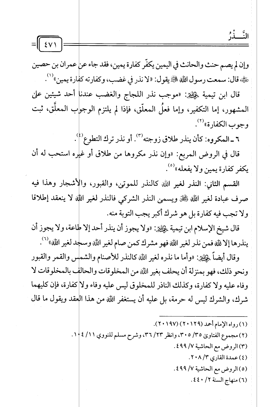 قال شيخ الإسلام ابن تيمية - رحمه الله -: "ولا يجوز أن ينذر أحد إلا طاعة، ولا يجوز أن ينذرها إلالله فمن نذر لغير الله فهو مشرك كمن صام لغير الله وسجد لغير الله" (¬٦).