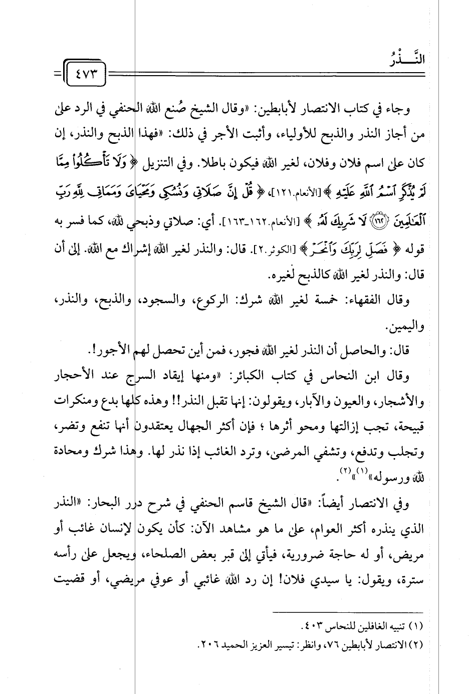 وفي الانتصار أيضًا: "قال الشيخ قاسم الحنفي في شرح درر البحار: "النذر الذي ينذره أكثر العوام، على ما هو مشاهد الآن: كأن يكون لإنسان غائب أو مريض، أو له حاجة ضرورية، فيأتي إلى قبر بعض الصلحاء، ويجعل على رأسه سترة، ويقول: يا سيدي فلان! إن رد الله غائبي أو عوفي مريضي، أو قضيت