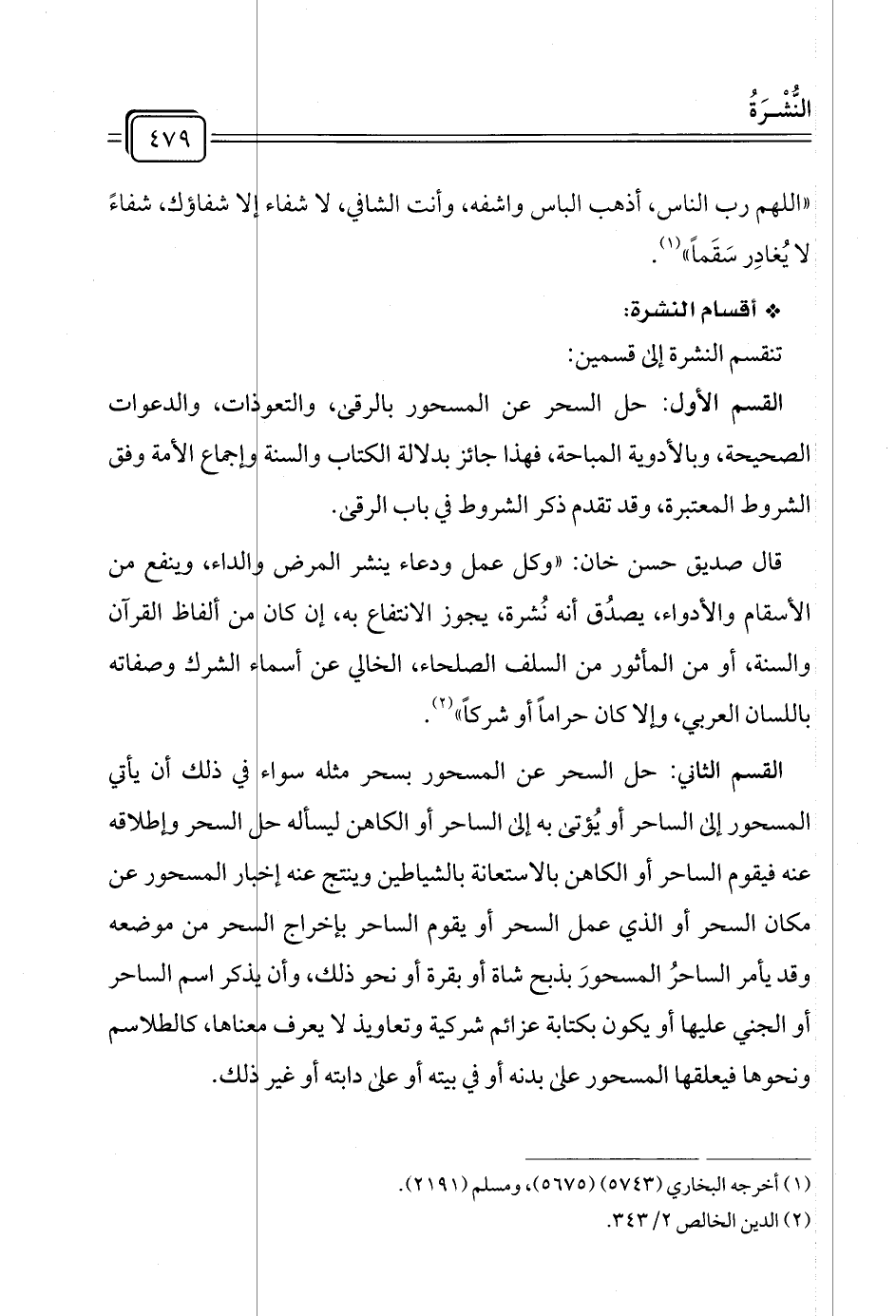 قال صديق حسن خان: "وكل عمل ودعاء ينشر المرض والداء، وينفع من الأسقام والأدواء، يصدُق أنه نُشرة، يجوز الانتفاع به، إن كان من ألفاظ القرآن والسنة، أو من المأثور من السلف الصلحاء، الخالي عن أسماء الشرك وصفاته باللسان العربي، وإلا كان حرامًا أو شركًا" (¬٢).