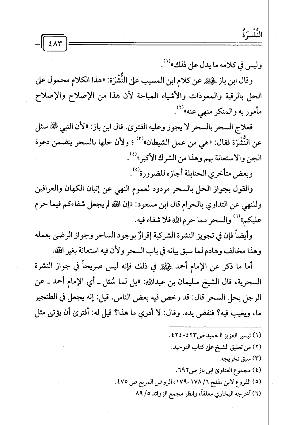 وقال ابن باز رحمه الله عن كلام ابن المسيب على النُّشْرَة: "هذا كلام محمول على الحل بالرقية والمعوذات والأشياء المباحة لأن هذا من الإصلاح والإصلاح مأمور به والمنكر منهي عنه" (¬٢).