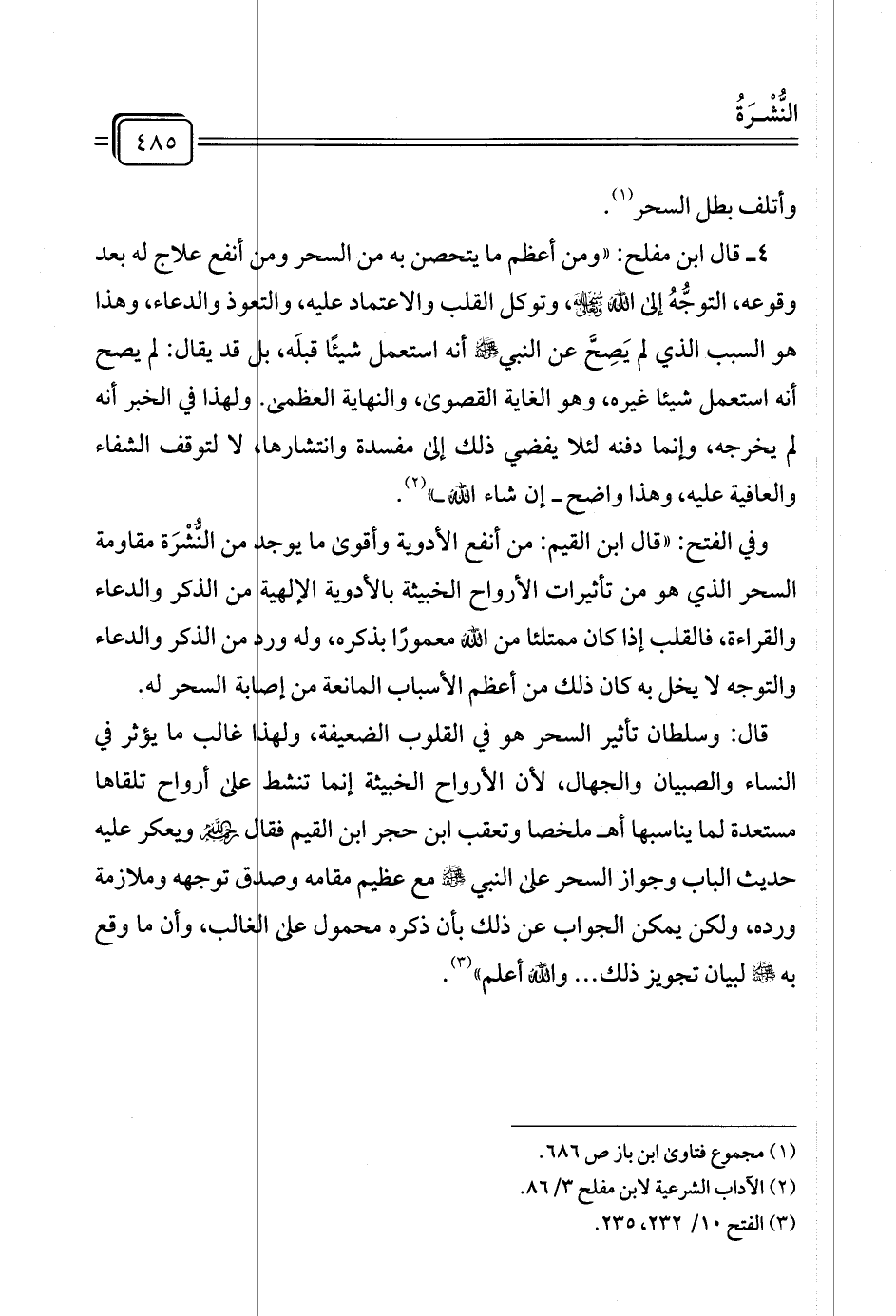 وفي الفتح: "قال ابن القيم: من أنفع الأدوية وأقوى ما يوجد من النُّشْرَة مقاومة السحر الذي هو من تأثيرات الأرواح الخبيثة بالأدوية الإلهية من الذكر والدعاء والقراءة، فالقلب إذا كان ممتلئا من الله معمورًا بذكره، وله ورد من الذكر والدعاء والتوجه لا يخل به كان ذلك من أعظم الأسباب المانعة من إصابة السحر له.