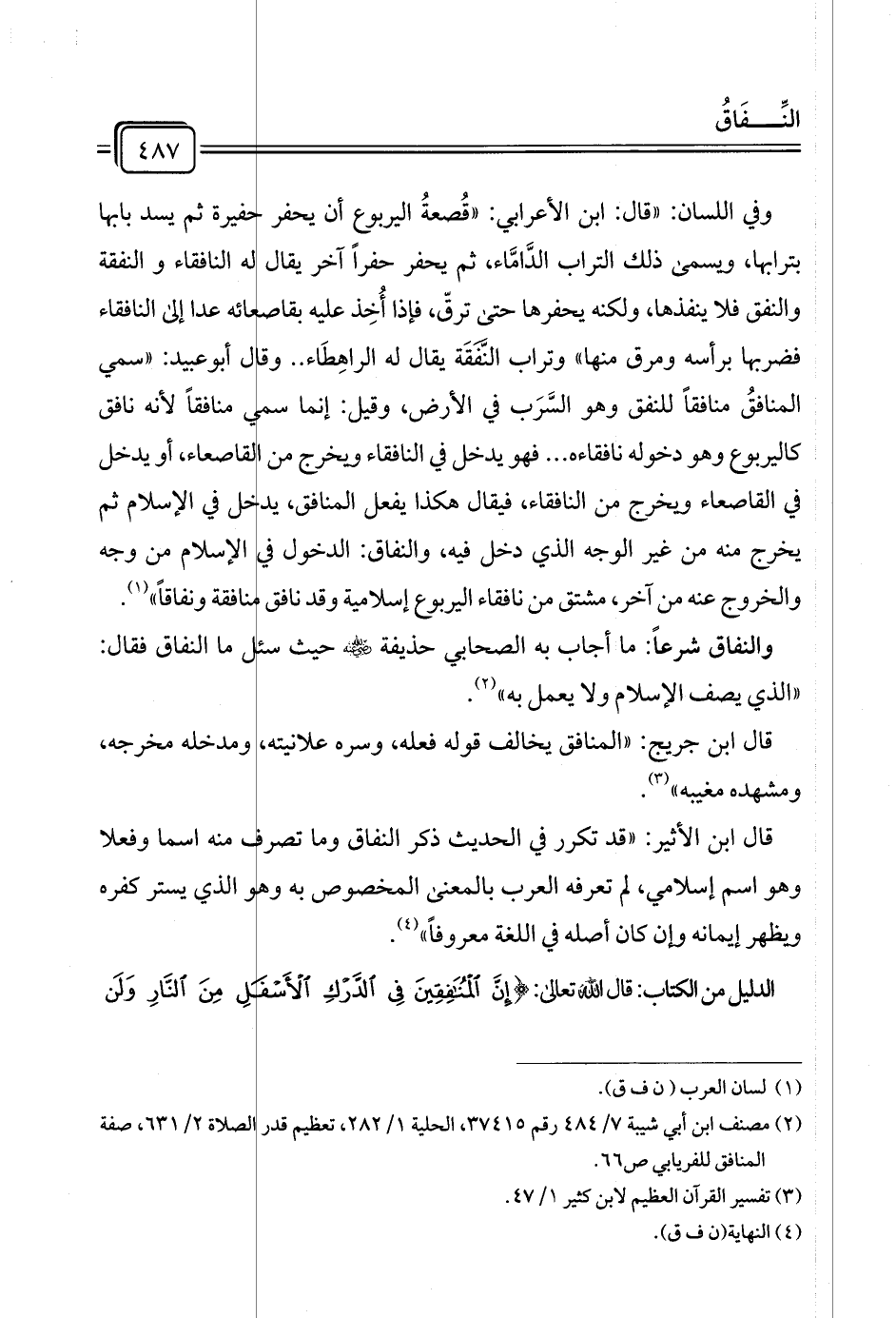 وفي اللسان: "قال: ابن الأعرابي: "قُصعةُ اليربوع أن يحفر حفيرة ثم يسد بابها بترابها، ويسمى ذلك التراب الدَّامَّاء، ثم يحفر حفرًا آخر يقال له النافقاء والنفقة والنفق فلا ينفذها، ولكنه يحفرها حتى ترقّ، فإذا أُخِذ عليه بقاصعائه عدا إلى النافقاء فضربها برأسه ومرق منها" وتراب النَّفَقَة يقال له الراهِطَاء .. وقال أبو عبيد: "سمي المنافقُ منافقًا للنفق وهو السَّرَب في الأرض، وقيل: إنما منافقًا لأنه نافق كاليربوع وهو دخوله نافقاءه ... فهو يدخل في النافقاء ويخرج من القاصعاء، أو يدخل في القاصعاء ويخرج من النافقاء، فيقال هكذا يفعل المنافق، يدخل في الإسلام ثم يخرج منه من غير الوجه الذي دخل فيه، والنفاق: الدخول في الإسلام من وجه والخروج عنه من آخر، مشتق من نافقاء اليربوع إسلامية وقد نافق منافقة ونفاقًا" (¬١).