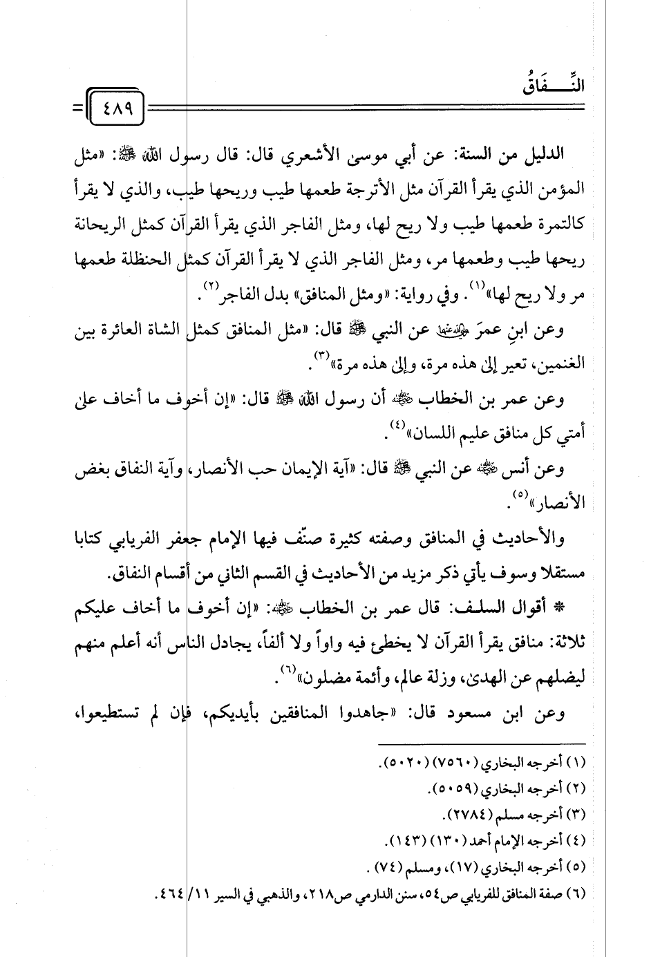 والأحاديث في المنافق وصفته كثيرة صنّف فيها الإمام جعفر الفريابي كتابا مستقلا وسوف يأتي ذكر مزيد من الأحاديث في القسم الثاني من أقسام النفاق.