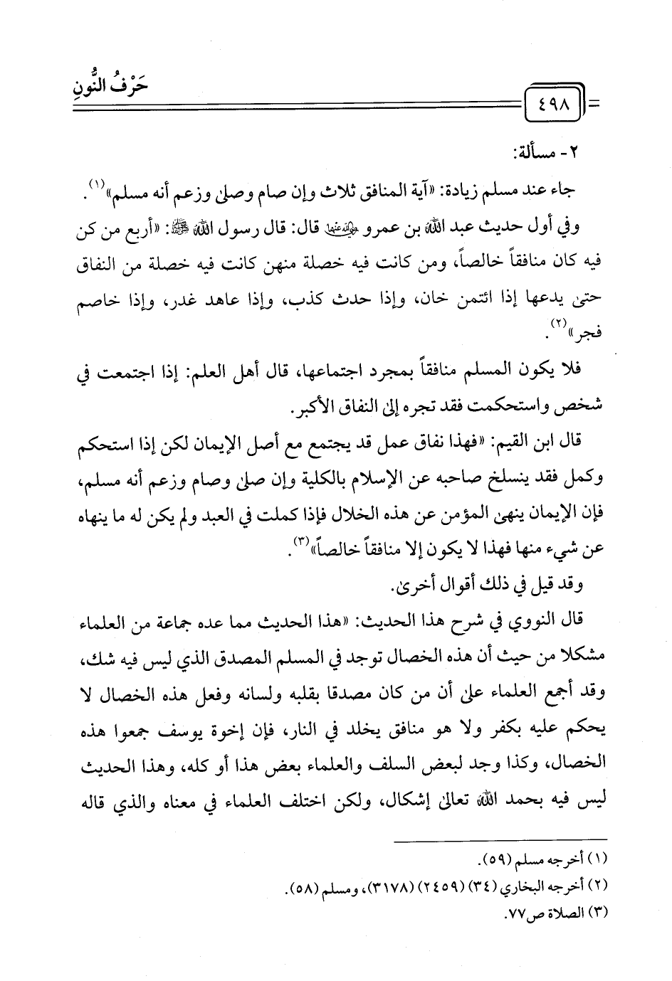 قال ابن القيم: "فهذا نفاق عمل قد يجتمع مع أصل الإيمان لكن إذا استحكم وكمل فقد ينسلخ صاحبه عن الإسلام بالكلية وإن صلى وصام وزعم أنه مسلم، فإن الإيمان ينهى المؤمن عن هذه الخلال فإذا كملت في العبد ولم يكن له ما ينهاه عن شيء منها فهذا لا يكون إلا منافقًا خالصًا" (¬٣).