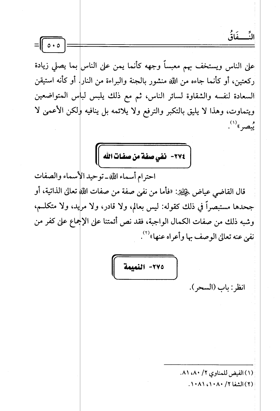 قال القاضي عياض رحمه الله: "فأما من نفى صفة من صفات الله تعالى الذاتية، أو جحدها مستبصرًا في ذلك كقوله: ليس بعالم، ولا قادر، ولا مريد، ولا متكلم، وشبه ذلك من صفات الكمال الواجبة، فقد نص أئمتنا على الإجماع على كفر من نفى عنه تعالى الوصف بها وأعراه عنها" (¬٢).