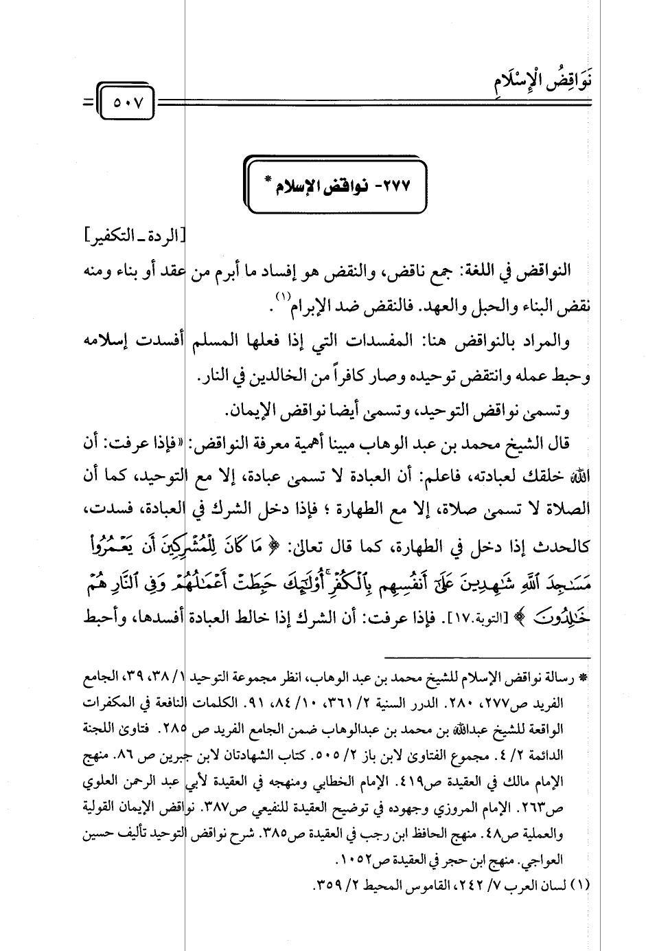 * رسالة نواقض الإسلام للشيخ محمد بن عبد الوهاب، انظر مجموعة التوحيد ١/ ٣٨، ٣٩، الجامع الفريد ص ٢٧٧، ٢٨٠ الدرر السنية ٢/ ٣٦١، ١٠/ ٨٤، ٩١ الكلمات النافعة في المكفرات الواقعة للشيخ عبد الله بن محمد بن عبد الوهاب ضمن الجامع الفريد ص ٢٨٥. فتاوى اللجنة الدائمة ٢/ ٤. مجموع الفتاوى لابن باز ٢/ ٥٠٥. كتاب الشهادتان لابن جبرين ص ٨٦. منهج الإمام مالك في العقيدة ص ٤١٩. الإمام الخطابي ومنهجه في العقيدة لأبي عبد الرحمن العلوي ص ٢٦٣. الإمام المروزي وجهوده في توضيح العقيدة للنفيعي ص ٣٨٧. نواقض الإيمان القولية والعملية ص ٤٨. منهج الحافظ ابن رجب في العقيدة ص ٣٨٧. شرح نواقض التوحيد تأليف حسين العواجي. منهج ابن حجر في العقيدة ص ١٠٥٢.