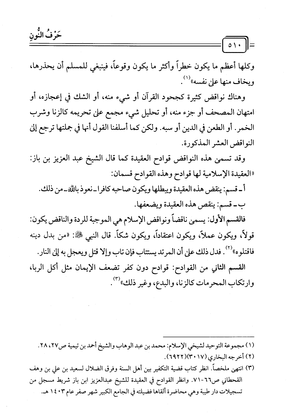 (¬٣) انتهى ملخصًا. انظر كتاب قضية التكفير بين أهل السنة وفرق الضلال لسعيد بن علي بن وهف القحطاني ص ٦٦ - ٧١. وانظر القوادح في العقيدة للشيخ عبد العزيز بن باز شريط مسجل من تسجيلات دار طيبة وهي محاضرة ألقاها فضيلته في الجامع الكبير شهر صفر عام ١٤٠٣ هـ.
