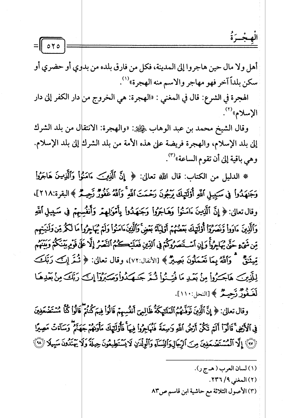 وقال الشيخ محمد بن عبد الوهاب رحمه الله: "والهجرة: الانتقال من بلد الشرك إلى بلد الإسلام، والهجرة فريضة على هذه الأمة من بلد الشرك إلى بلد الإسلام. وهي باقية إلى أن تقوم الساعة" (¬٣).