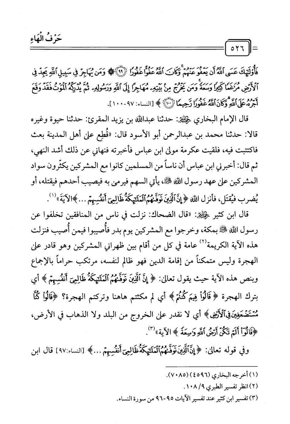 قال الإمام البخاري رحمه الله: حدثنا عبد الله بن يزيد المقرئ: حدثنا حيوة وغيره قالا: حدثنا محمد بن عبد الرحمن أبو الأسود قال: "قُطِع على أهل المدينة بعث فاكتتبت فيه، فلقيت عكرمة مولى ابن عباس فأخبرته فنهاني عن ذلك أشد النهي، ثم قال: أخبرني ابن عباس أن ناسًا من المسلمين كانوا مع المشركين يكثّرون سواد المشركين على عهد رسول الله - صلى الله عليه وسلم -، يأتي السهم فيرمى به فيصيب أحدهم فيقتله، أو يُضرب فيُقتَل، فأنزل الله {إِنَّ الَّذِينَ تَوَفَّاهُمُ الْمَلَائِكَةُ ظَالِمِي أَنْفُسِهِمْ ... } الآيةَ" (¬١).