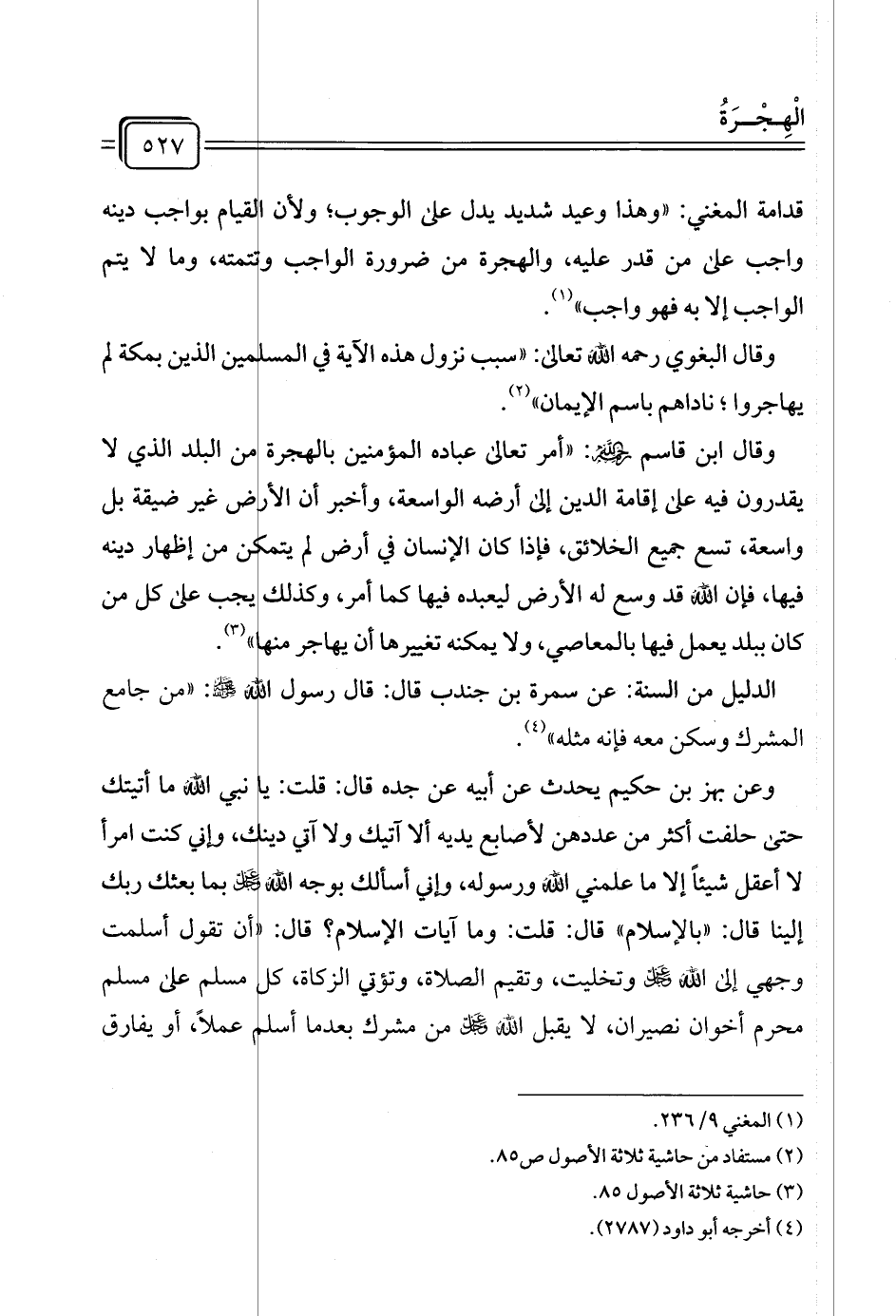 قدامة المغني: "وهذا وعيد شديد يدل على الوجوب؛ ولأن القيام بواجب دينه واجب على من قدر عليه، والهجرة من ضرورة الواجب وتتمته، وما لا يتم الواجب إلا به فهو واجب" (¬١).