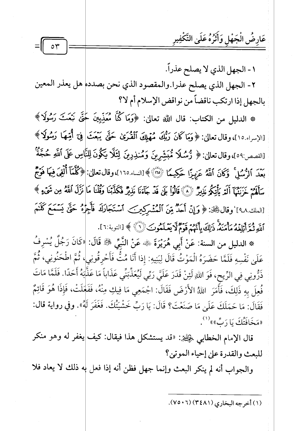 * الدليل من السنة: عَنْ أَبِي هُرَيْرَةَ - رضي الله عنه - عَنْ النَّبِيِّ - صلى الله عليه وسلم - قَالَ: "كَانَ رَجُلٌ يُسْرِفُ عَلَى نَفْسِهِ فَلَمَّا حَضَرَهُ الْمَوْتُ قَالَ لِبَنِيهِ: إِذا أنا مُتُّ فَأَحْرِقُونِي، ثُمَّ اطْحَنُونِي، ثُمَّ ذَرُّوني فِي الرِّيحِ، فَوَالله لَئِنْ قَدَرَ عَلَيَّ رَبِّي لَيُعَذِّبَنِّي عَذَابًا مَا عذَّبهُ أَحَدًا. فَلَمَّا مَاتَ فُعِلَ بِهِ ذَلِكَ، فَأَمَرَ اللهُ الأَرْضَ فَقَالَ: اجْمَعِي مَا فِيكِ مِنْه، فَفَعَلَتْ، فَإِذَا هُوَ قَائِمٌ فَقَالَ: مَا حَمَلَكَ عَلَى مَا صَنَعْتَ؟ قَالَ: يَا رَبِّ خَشْيَتُكَ. فَغَفَر له". وفي رواية قال: "مَخَافَتُكَ يَا رَبِّ"" (¬١).