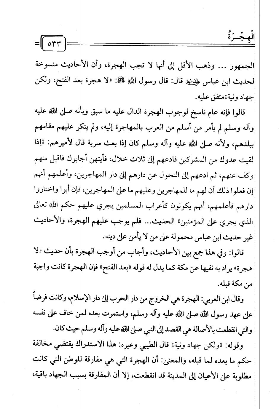 وقال ابن العربي: الهجرة هي الخروج من دار الحرب إلى دار الإسلام، وكانت فرضًا على عهد رسول الله صلى الله عليه وآله وسلم، واستمرت بعده لمن خاف على نفسه والتي انقطعت بالأصالة هي القصد إلى النبي صلى الله عليه وآله وسلم حيث كان.
