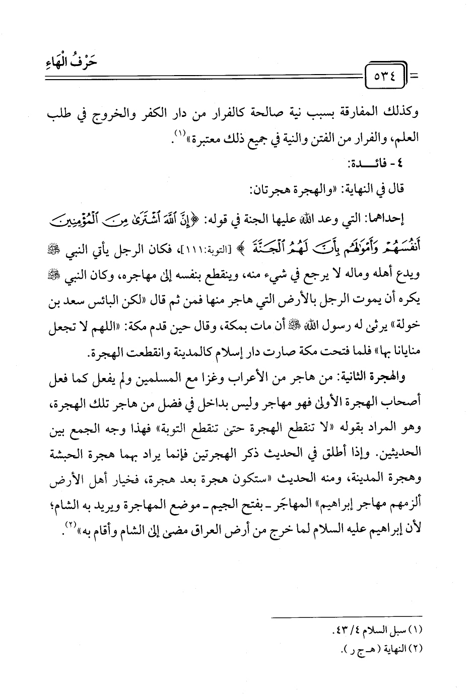 والهجرة الثانية: من هاجر من الأعراب وغزا مع المسلمين ولم يفعل كما فعل أصحاب الهجرة الأولى فهو مهاجر وليس بداخل في فضل من هاجر تلك الهجرة، وهو المراد بقوله "لا تنقطع الهجرة حتى تنقطع التوبة" فهذا وجه الجمع بين الحديثين. وإذا أطلق في الحديث ذكر الهجرتين فإنما يراد بهما هجرة الحبشة وهجرة المدينة، ومنه الحديث "ستكون هجرة بعد هجرة، فخيار أهل الأرض ألزمهم مهاجر إبراهيم" المهاجَر - بفتح الجيم - موضع المهاجرة ويريد به الشام؛ لأن إبراهيم عليه السلام لما خرج من أرض العراق مضى إلى الشام وأقام به" (¬٢).
