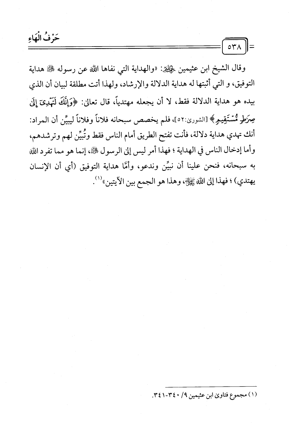 وقال الشيخ ابن عثيمين - رَحِمَه اللَّهُ -: "والهداية التي نفاها الله عن رسوله - صلى الله عليه وسلم - هداية التوفيق، والتي أثبتها له هداية الدلالة والإرشاد، ولهذا أتت مطلقة لبيان أن الذي بيده هو هداية الدلالة فقط، لا أن يجعله مهتديًا، قال تعالى: {وَإِنَّكَ لَتَهْدِي إِلَى صِرَاطٍ مُسْتَقِيمٍ} [الشورى: ٥٢]، فلم يخصص سبحانه فلانًا وفلانًا ليبيِّن أن المراد: أنك تهدي هداية دلالة، فأنى ت تفتح الطريق أمام الناس فقط وتُبيِّن لهم وترشدهم، وأما إدخال الناس في الهداية، فهذا أمر ليس إلى الرسول - صلى الله عليه وسلم -، إنما هو مما تفرد الله به سبحانه، فنحن علينا أن، نبيِّن وندعو، وأمَّا هداية التوفيق (أي أن الإنسان يهتدي)؛ فهذا إلى الله - سُبْحَانَهُ وتَعَالى -، هذا هو الجمع بين الآيتين" (¬١).