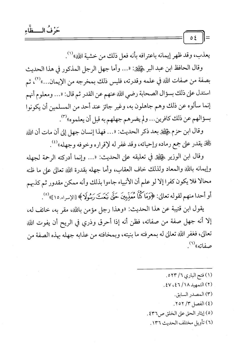 وقال ابن الوزير رحمه الله في تعليقه على الحديث: " ... وإنما أدركته الرحمة لجهله وإيمانه بالله والمعاد ولذلك خاف العقاب، وأما جهله بقدرة الله تعالى على ما ظنه محالا فلا يكون كفرا إلا لو علم أن الأنبياء جاءوا بذلك وأنه ممكن مقدور ثم كذبهم أو أحدا منهم لقوله تعالى: {وَمَا كُنَّا مُعَذِّبِينَ حَتَّى نَبْعَثَ رَسُولًا} [الإسراء. ١٥] (¬٥).