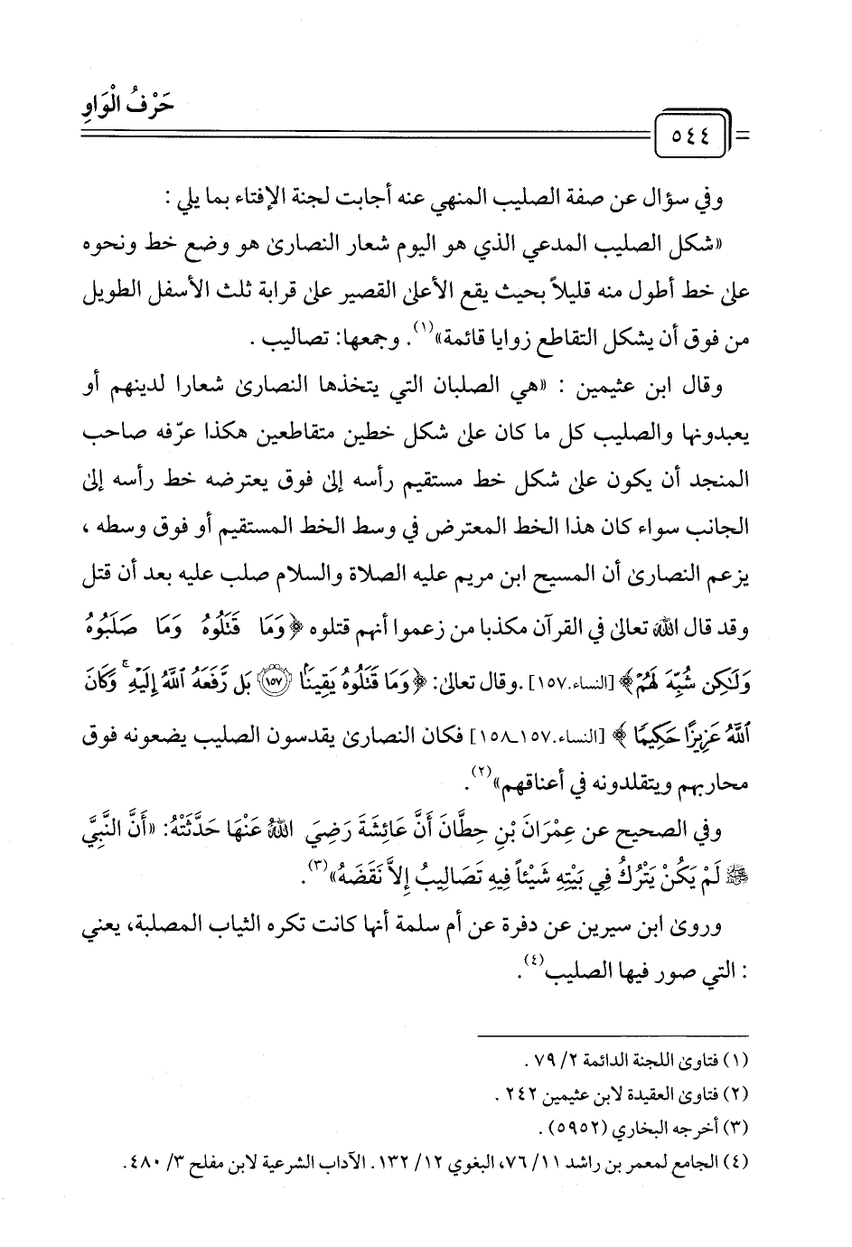 وقال ابن عثيمين: "هي الصلبان التي يتخذها النصارى شعارا لدينهم أو يعبدونها والصليب كل ما كان على شكل خطين متقاطعين هكذا عرّفه صاحب المنجد أن يكون على شكل خط مستقيم رأسه إلى فوق يعترضه خط رأسه إلى الجانب سواء كان هذا الخط المعترض في وسط الخط المستقيم أو فوق وسطه، يزعم النصارى أن المسيح ابن مريم عليه الصلاة والسلام صلب عليه بعد أن قتل وقد قال الله تعالى في القرآن مكذبا من زعموا أنهم قتلوه {وَمَا قَتَلُوهُ وَمَا صَلَبُوهُ وَلَكِنْ شُبِّهَ لَهُمْ} [النساء: ١٥٧]. وقال تعالى: {وَمَا قَتَلُوهُ يَقِينًا (١٥٧) بَلْ رَفَعَهُ اللَّهُ إِلَيْهِ وَكَانَ اللَّهُ عَزِيزًا حَكِيمًا} [النساء: ١٥٧، ١٥٨]، فكان النصارى يقدسون الصليب يضعونه فوق محاربهم ويتقلدونه في أعناقهم" (¬٢).