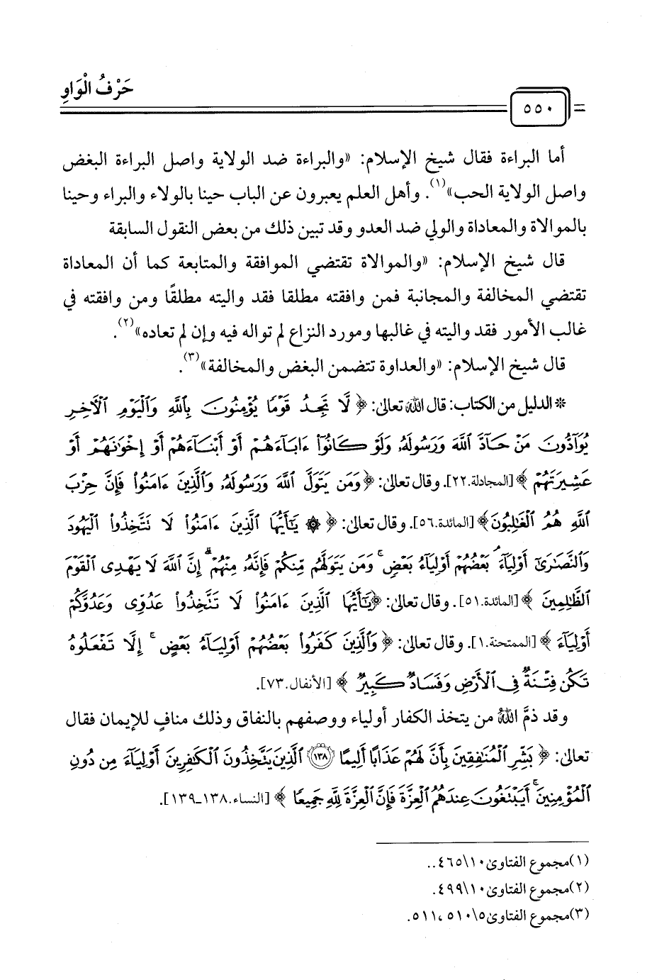 * الدليل من الكتاب: قال الله تعالى: {لَا تَجِدُ قَوْمًا يُؤْمِنُونَ بِاللَّهِ وَالْيَوْمِ الْآخِرِ يُوَادُّونَ مَنْ حَادَّ اللَّهَ وَرَسُولَهُ وَلَوْ كَانُوا آبَاءَهُمْ أَوْ أَبْنَاءَهُمْ أَوْ إِخْوَانَهُمْ أَوْ عَشِيرَتَهُمْ} [المجادلة: ٢٢]. وقال تعالى: {وَمَنْ يَتَوَلَّ اللَّهَ وَرَسُولَهُ وَالَّذِينَ آمَنُوا فَإِنَّ حِزْبَ اللَّهِ هُمُ الْغَالِبُونَ} [المائدة: ٥٦]. وقال تعالى: {يَاأَيُّهَا الَّذِينَ آمَنُوا لَا تَتَّخِذُوا الْيَهُودَ وَالنَّصَارَى أَوْلِيَاءَ بَعْضُهُمْ أَوْلِيَاءُ بَعْضٍ وَمَنْ يَتَوَلَّهُمْ مِنْكُمْ فَإِنَّهُ مِنْهُمْ إِنَّ اللَّهَ لَا يَهْدِي الْقَوْمَ الظَّالِمِينَ} [المائدة: ٥١]. وقال تعالى: {يَاأَيُّهَا الَّذِينَ آمَنُوا لَا تَتَّخِذُوا عَدُوِّي وَعَدُوَّكُمْ أَوْلِيَاءَ} [الممتحنة: ١]. وقال تعالى: {وَالَّذِينَ كَفَرُوا بَعْضُهُمْ أَوْلِيَاءُ بَعْضٍ إِلَّا تَفْعَلُوهُ تَكُنْ فِتْنَةٌ فِي الْأَرْضِ وَفَسَادٌ كَبِيرٌ} [الأنفال: ٧٣].