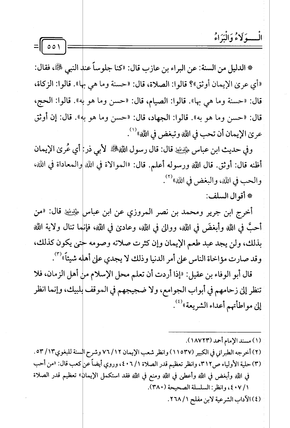 * الدليل من السنة: عن البراء بن عازب قال: "كنا جلوسًا عند النبي - صلى الله عليه وسلم -، فقال: "أي عرى الإيمان أوثق"؟ قالوا: الصلاة، قال: "حسنة وما هي بها". قالوا: الزكاة، قال: "حسنة وما هي بها". قالوا: الصيام، قال: "حسن وما هو". قالوا: الحج، قال: "حسن وما هو به". قالوا: الجهاد، قال: "حسن وما هو". قال: إن أوثق عرى الإيمان أن تحب في الله وتبغض في الله" (¬١).